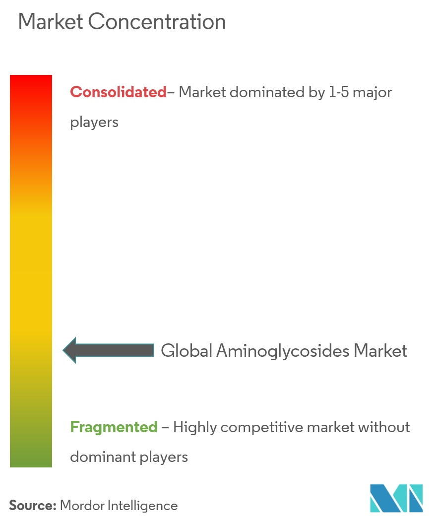 The aminoglycosides market is moderately fragmented and competitive. The market studied is composed of a large number of players and includes both small and large pharmaceutical manufacturers. Additionally, the increasing antibiotic resistance has prompted many early-stage biotechnology enterprises to enter this market. The expiry of patent exclusivity has led to large-scale generic manufacturing of aminoglycosides, particularly in the developing region of Asia-Pacific. The key market players include Cipla Limited, Pfizer Inc., AbbVie Inc. (Allergan PLC), Teva Pharmaceutical Industries Ltd, and Zoetis Inc., among others.