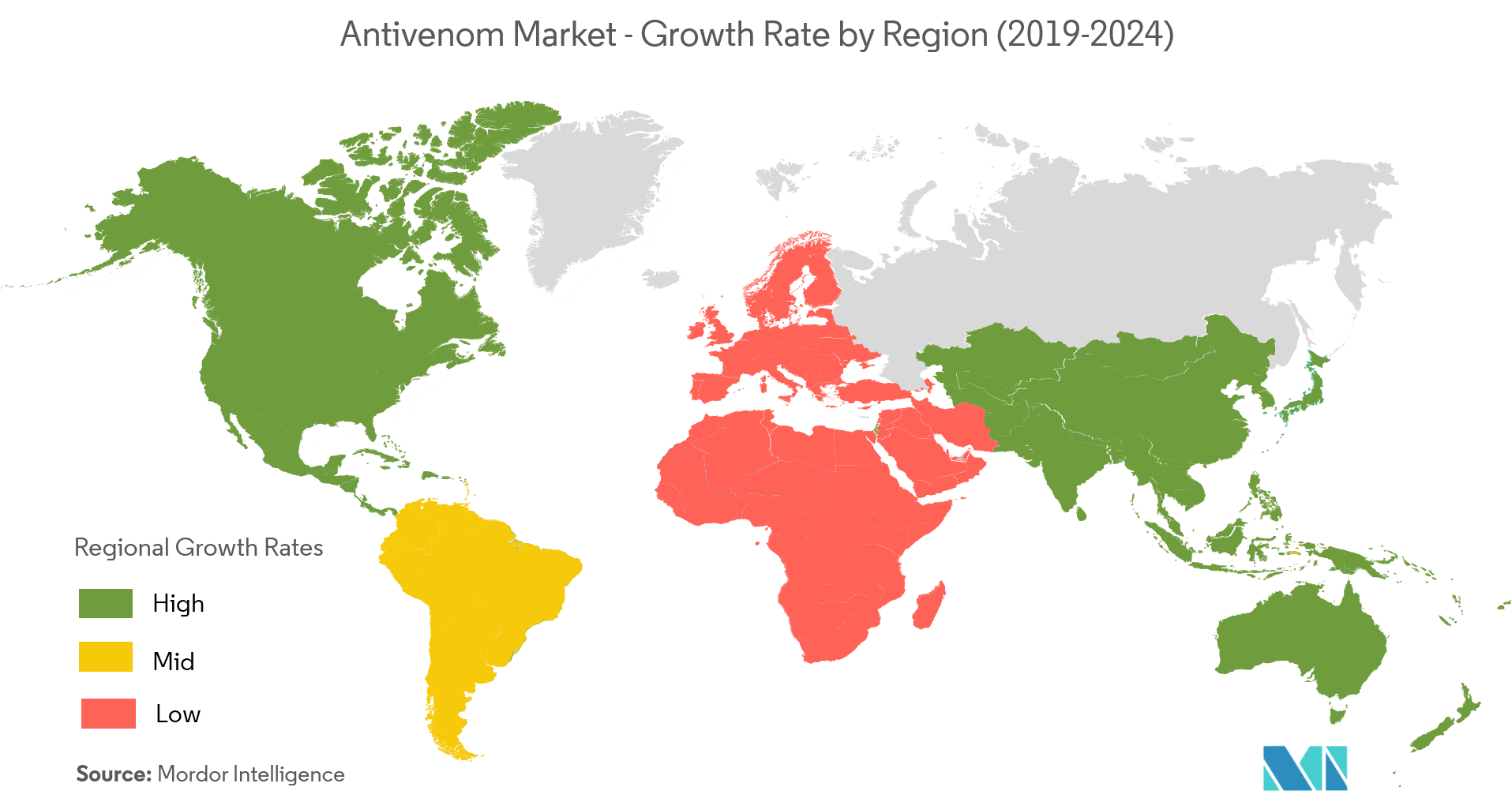 By geography, North America led with 42.03% antivenoms market share in 2024, Asia-Pacific is forecast to record the highest regional CAGR at 4.14% through 2030.