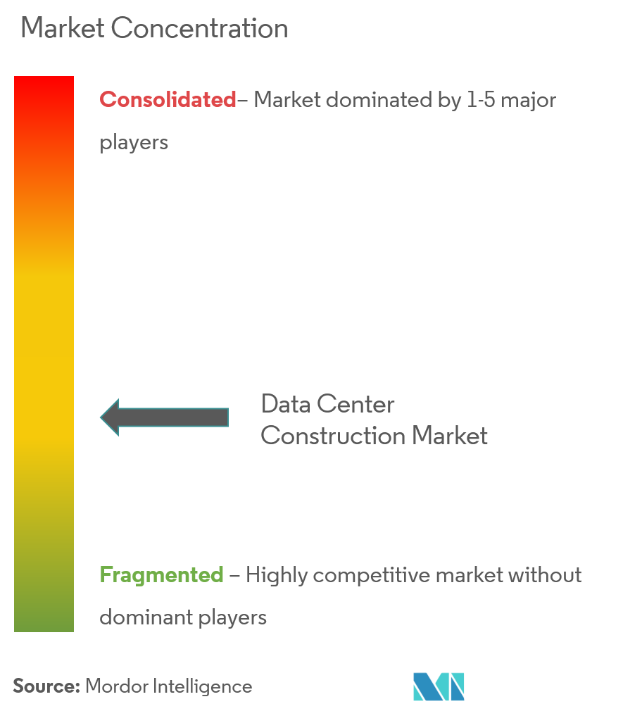 The data center construction market remains moderately fragmented. Turner Construction, DPR Construction, and AECOM anchor the top tier with deep hyperscale credentials and design-build delivery models, securing multi-year framework contracts. M&A appetite intensified in 2024 as strategic players chased vertical integration: Eaton’s USD 1.4 billion purchase of Fibrebond brought modular-steel fabrication in-house, while Siemens partnered with Compass Datacenters for custom electrical rooms that cut construction cycles to nine months.