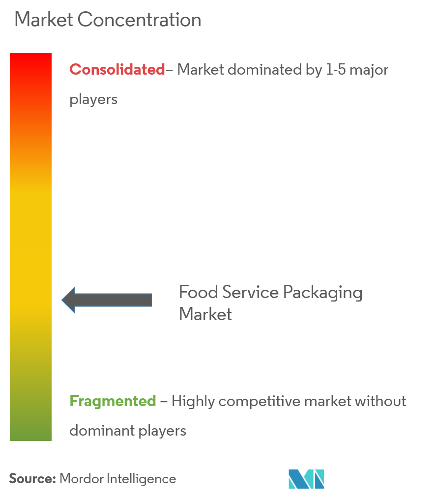 The food service packaging market shows moderate concentration, with the top five suppliers controlling roughly 45 % of global revenue. Novolex’s USD 6.7 billion takeover of Pactiv Evergreen in March 2025 forged the largest North American platform spanning RPET lids, fiber trays, and paper carryout bags. Huhtamäki continues to leverage its global molded-fiber capacity to secure multinational QSR contracts, while Dart Container focuses on lightweight PP and PS cups for price-sensitive convenience channels. Sabert differentiates through proprietary recycled blends and design services that tailor trays for premium ready-meal producers.
