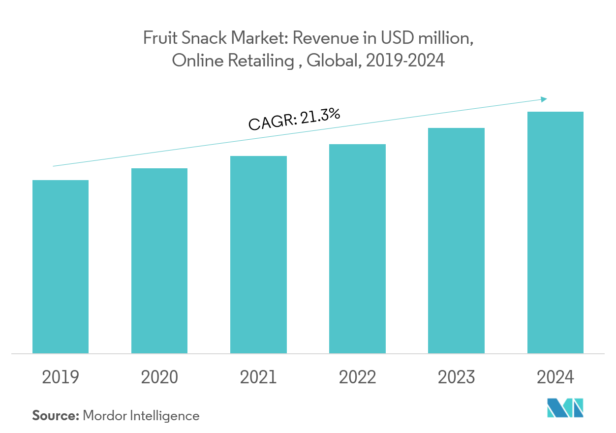 Fruit snacks are a type of snack made of different kinds of fruits or flavors. Fruit snacks are consumed and preferred by all age groups due to their unique taste and health benefits. The fruit snack market is segmented by product type into sweet and savory chips, candies and bars, dairy-based, and other fruit snacks, by distribution channel into supermarkets/hypermarkets, convenience stores, specialist retailers, online retailing, and other distribution channels, and by geography into North America, Europe, Asia-Pacific, South America, and Middle East and Africa. For each segment, the market sizing and forecasts have been done on the basis of value (in USD million)