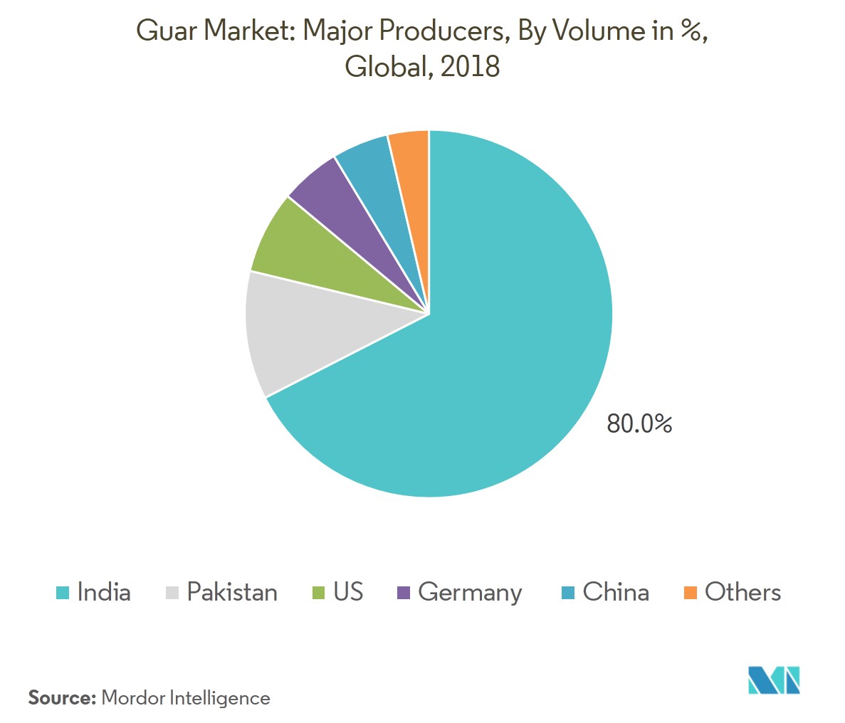 - Asia-Pacific leads the world in guar production, with India at the forefront. India and Pakistan account for over 95% of global guar gum production. While the harvested area for guar in India has remained consistent for nearly a decade, production has surged, driven by enhanced productivity. For instance, in 2023, according to ITC Trade Map, India ranked top in exports in terms of value with USD 320,980.8, Spain ranked second with USD 124,410.4, and Italy ranked third with USD 112,969. Spain uses advanced technology in the processing of guar gum powder to increase its usability. Currently, India exports guar gum to over 90 countries. This robust export activity solidifies the Asia-Pacific's position as the leading producer and exporter of guar gum during the study period.