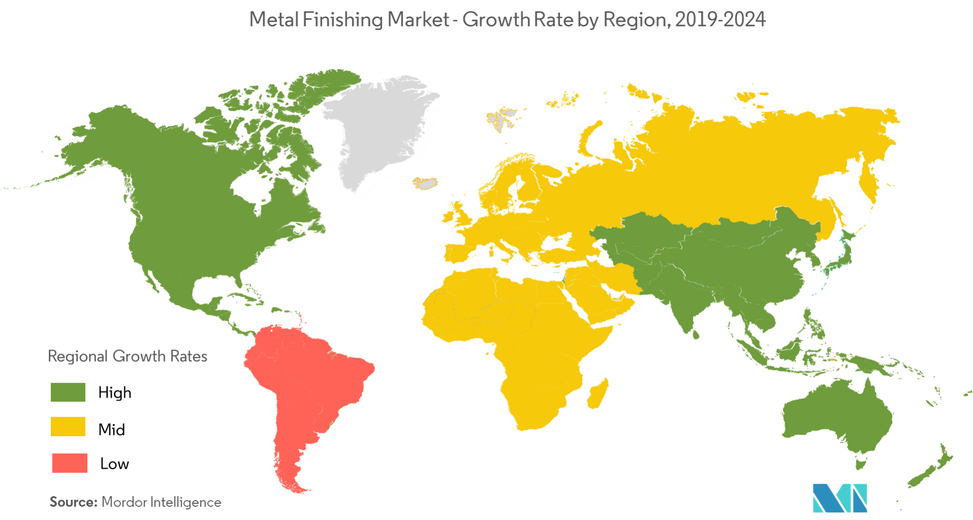 The Asia Pacific controlled 41.29% of the metal finishing market size in 2024 and also recorded the fastest regional CAGR at 5.35% through 2030, buoyed by China’s vehicle output and India’s electronics PLI investments. Regional suppliers incorporate trivalent and fluorine-free chemistries to meet the requirements of their export customers. Japanese OEMs refine zinc-magnesium coatings for long-service vehicles in coastal regions, while South Korean fabs deploy AI-driven plating cells to serve 5nm chip packaging.