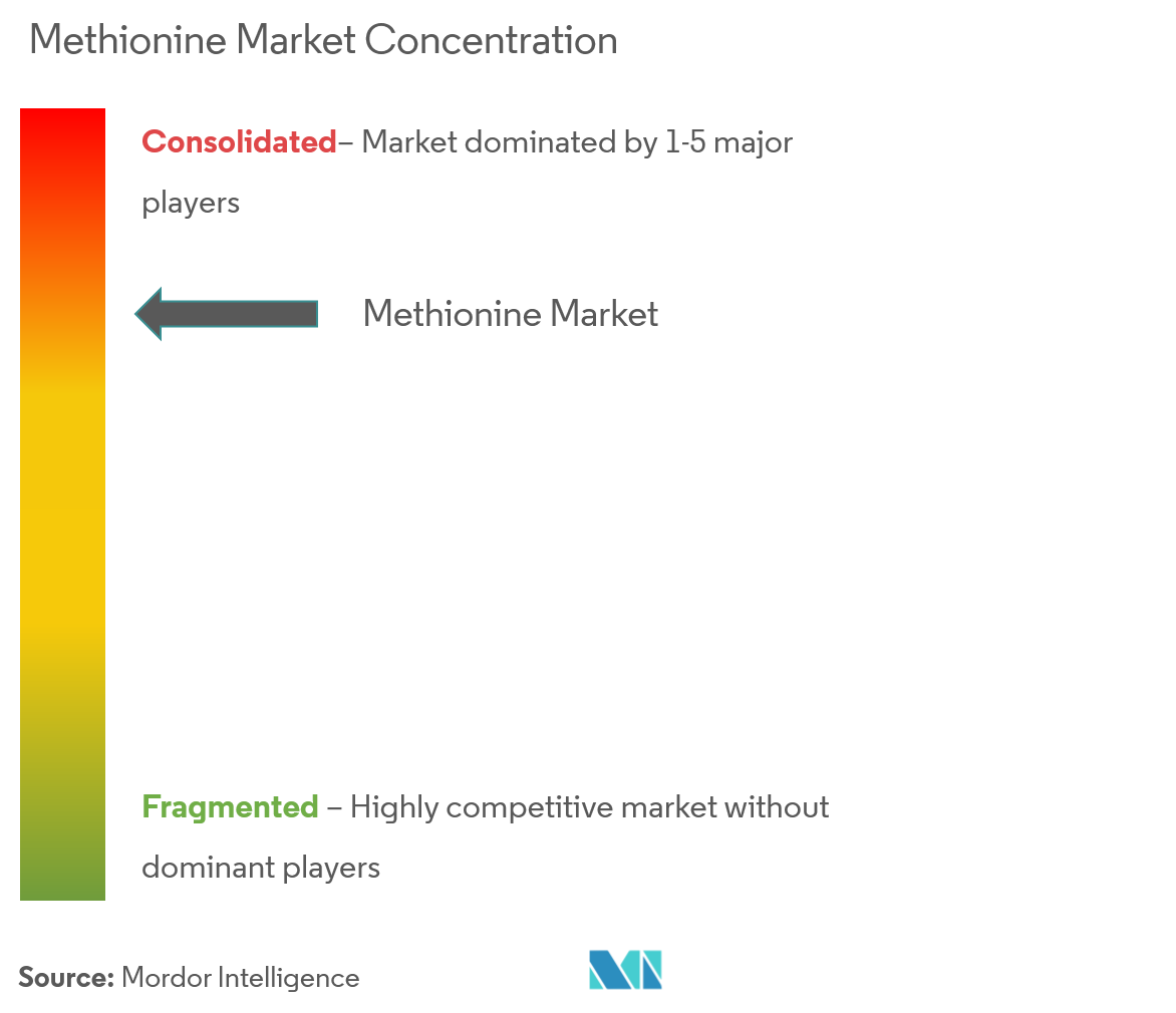 The methionine market is highly concentrated, with Evonik Industries, Adisseo, Sumitomo Chemical, CJ CheilJedang, and Novus International, Inc., holding a major share. Chinese players accelerate capacity with state-backed financing and process intensification, gradually eroding cost advantages enjoyed by Western incumbents. Competitive differentiation is migrating from pure tonnage to holistic nutrition platforms that package methionine with analytics, software, and adjacent additives.
