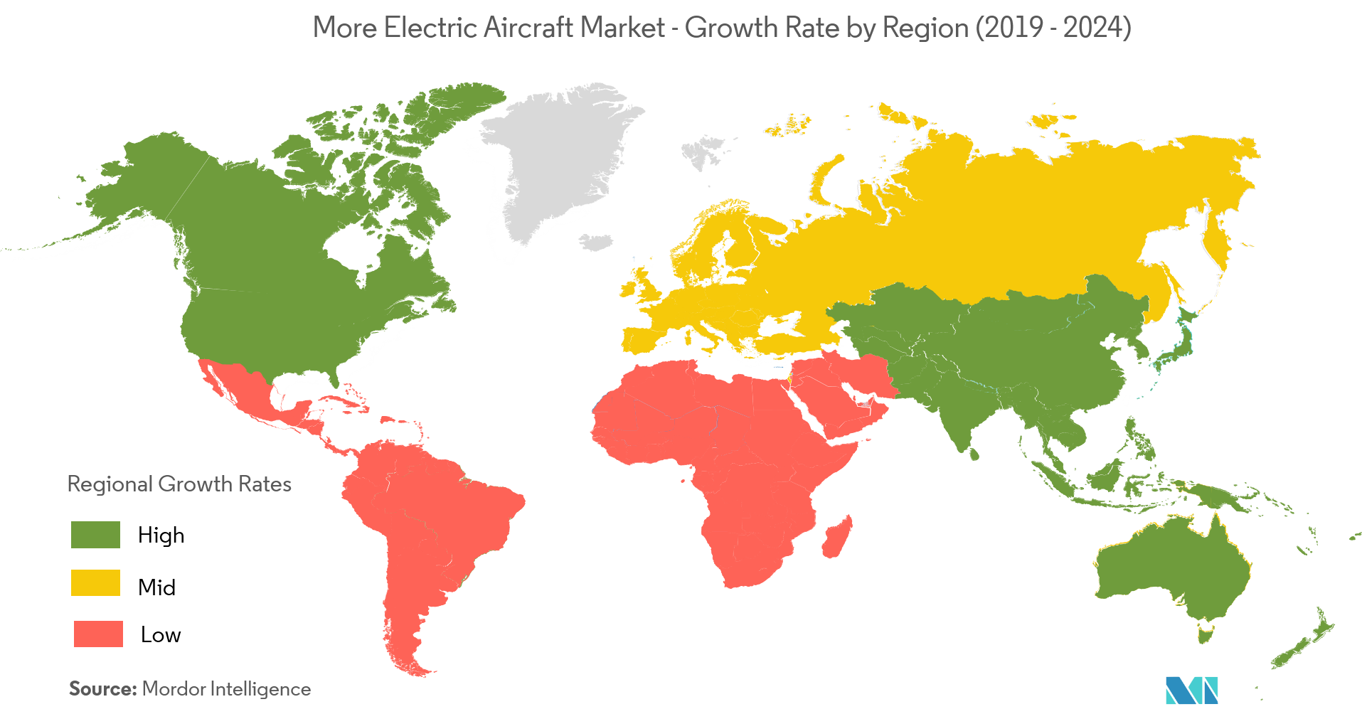 Asia-Pacific records the highest growth at a 12.45% CAGR. China’s Civil Aviation Administration earmarked dedicated low-altitude corridors for eVTOL logistics and passenger shuttles, compressing commercial deployment timelines. State plans to build a trillion-yuan general-aviation industry by 2030, injecting subsidies and regulatory certainty to attract foreign Tier-2 suppliers. Japan and South Korea focus on urban demonstrator flights for Expo-type events, offering a showcase before broader certification. However, airport readiness lags. India explores electric regional turboprops for short-haul routes under the UDAN connectivity scheme. The region’s diverse market entries collectively translate into sustained order books for battery, motor, and avionics vendors, ensuring Asia-Pacific remains the principal volume driver in the more electric aircraft market.