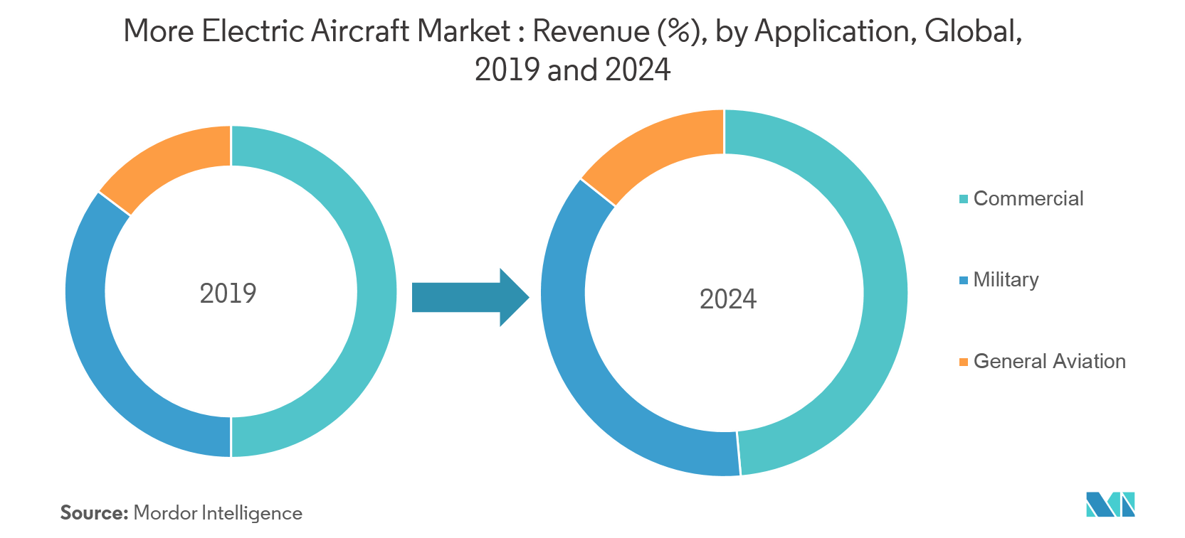 The more electric aircraft market is segmented by application and geography. By application, the market has been segmented into commercial, military, and general aviation. The report also covers the market sizes and forecasts for the more electric aircraft market in major countries across different regions. For each segment, the market size is provided in terms of value (USD).