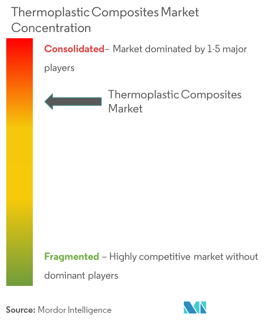 The thermoplastic composites industry is a highly fragmented industry. Recent strategic moves point to vertical-integration races: resin makers such as BASF spin up captive compounding lines, while fiber producers enter tape lay-up through joint ventures, compressing margins for intermediate converters. A market-wide inference is that such integration reduces transaction layers, potentially lowering end-part costs and thereby accelerating volume growth.