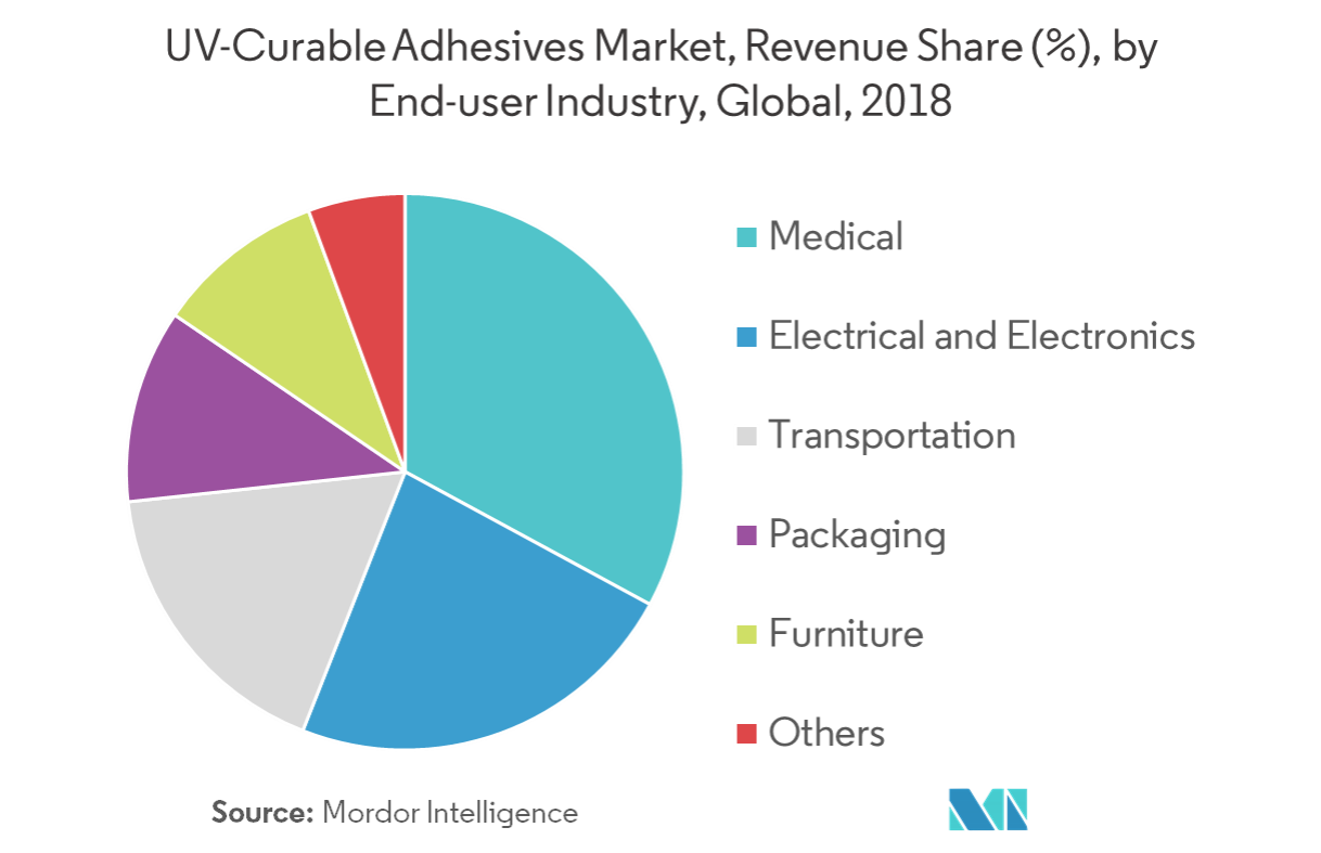 The UV-curable adhesives market is segmented by resin type, end-user industry, and geography. By resin type, the market is segmented into silicone, acrylic, polyurethane, epoxy, and other resin types. By end-user industry, the market is segmented into medical, electrical and electronics, transportation, packaging, furniture, and other end-user industries. The report also covers the market sizes and forecasts for the UV-curable adhesives market in 27 countries across major regions. The report offers market sizes and forecasts in value (USD) for all the above segments.