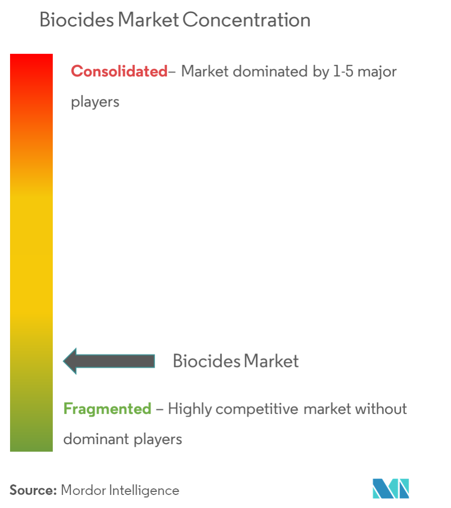 صناعة المبيدات الحيوية مجزأة، حيث يتحكم أفضل خمسة بائعين بشكل جماعي في أقل من 35% من الإيرادات. تنشر BASF وDow وLANXESS بصمات تصنيع عالمية ومختبرات تطبيق غنية بالبيانات لتخصيص الخلائط للاحتياجات المحلية، مما يعزلهم بفعالية من صدمات المناطق الفردية. ومع ذلك، تتآكل حصة المبتكرين الأصغر في قطاعات مثل المواد الحافظة الحيوية، مما يؤكد أن المرونة يمكن أن تتفوق على النطاق حيث حزم علم السموم الجديدة أخف.