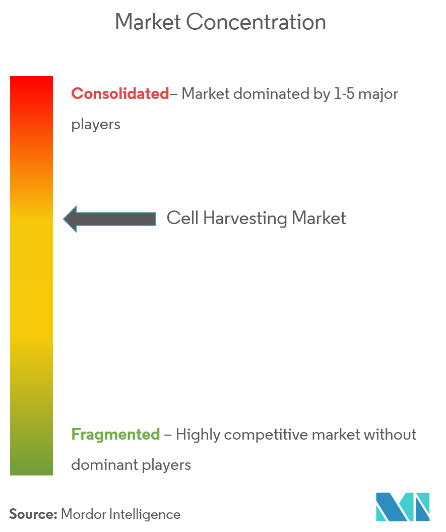 يتميز سوق حصاد الخلايا بتجزئة معتدلة، ومع ذلك فإن التركز يتسارع. استحواذ ثيرمو فيشر بقيمة 4.1 مليار دولار أمريكي على أعمال التنقية والترشيح لشركة سولفينتوم واندماج داناهر بين سايتيفا وبال في كيان معالجة حيوية بقيمة 7.5 مليار دولار أمريكي يوضحان تقارب المنصات. الباعة الكبار يستفيدون من النطاق لتقديم أجنحة متكاملة من المنبع إلى المصب، مما يضغط على المتخصصين الأصغر المركزين على طرائق واحدة. الشركات متوسطة الحجم تميز عبر العمق التكنولوجي-على سبيل المثال، الفصل المغناطيسي لميلتنيي بايوتك أو الطرد المركزي منخفض القص لساتوريوس-وبتقديم خطط تمويل مرنة جذابة للعملاء الأصغر.
