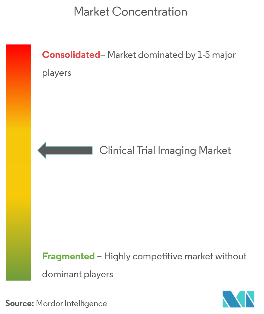 يتميز سوق التصوير في التجارب السريرية بالتشتت المعتدل، حيث يسيطر أفضل خمسة موردين على ما يُقدر بـ 45-50% من الإيرادات العالمية. الكثافة التنافسية ترتفع حيث تنتقل شركات المعدات إلى أعلى نحو البرمجيات والتحليلات، بينما تدفع CROs إلى أسفل نحو ملكية الطرق لتأمين الهامش وإغلاق العملاء. Clario و ICON Medical Imaging و IXICO هي معايير عالمية بفضل الاتساع العلاجي والمنصات الخاصة والوصول الجغرافي. تمايزهم يتوقف على خوارزميات الذكاء الاصطناعي المتكاملة التي تطبع البيانات من ماسحات متباينة وتؤتمت القراءات الحجمية عبر مجالات علم الأورام وعلم الأعصاب وأمراض القلب.