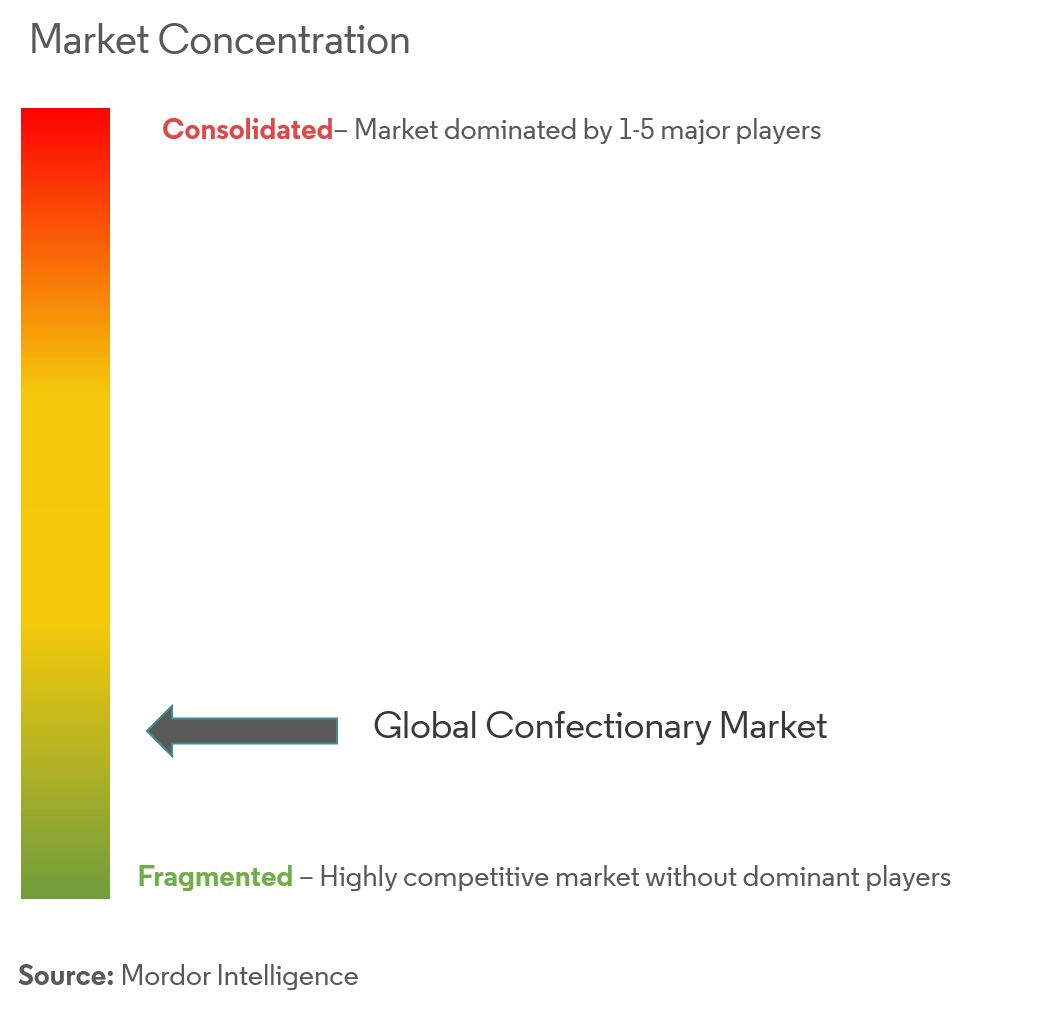 ومع التواجد العالمي الضخم وشبكات التوزيع الواسعة، فإن اللاعبين الرئيسيين، مثل Mars Incorporated، وMondelez International، وFerrero Group، وMondelēz International، وNestle SA، يمتلكون حصصًا بارزة في سوق الحلويات العالمية. يركز اللاعبون الرئيسيون على قنوات التوزيع عبر الإنترنت للتسويق عبر الإنترنت والعلامات التجارية لمنتجاتهم من أجل توسيع نطاق وصولهم الجغرافي وزيادة قاعدة عملائهم. تركز الشركات الرائدة في سوق الحلويات على الاستفادة من الفرص التي توفرها الأسواق الناشئة، مثل الصين والهند، لتوسيع قاعدة إيراداتها بسبب ارتفاع مستويات الدخل وتفضيل أنواع مختلفة من منتجات الحلويات، بسبب محفظة المنتجات المتنوعة، والتي تشمل الفاكهة والشوكولاتة المبنية على الجوز، والشوكولاتة الداكنة، والشوكولاتة المنكهة.
