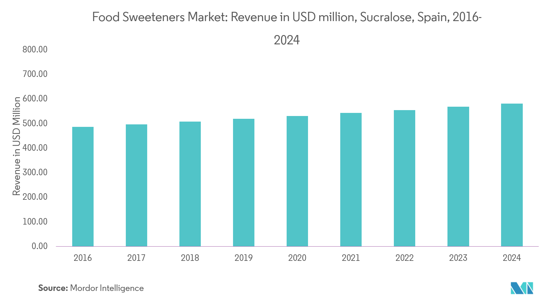 تبلغ قيمة سوق التحلية الغذائية في إسبانيا 1.44 مليار دولار أمريكي للعام الحالي ومن المتوقع أن تسجل معدل نمو سنوي مركب قدره 2.86٪ خلال الفترة المتوقعة.