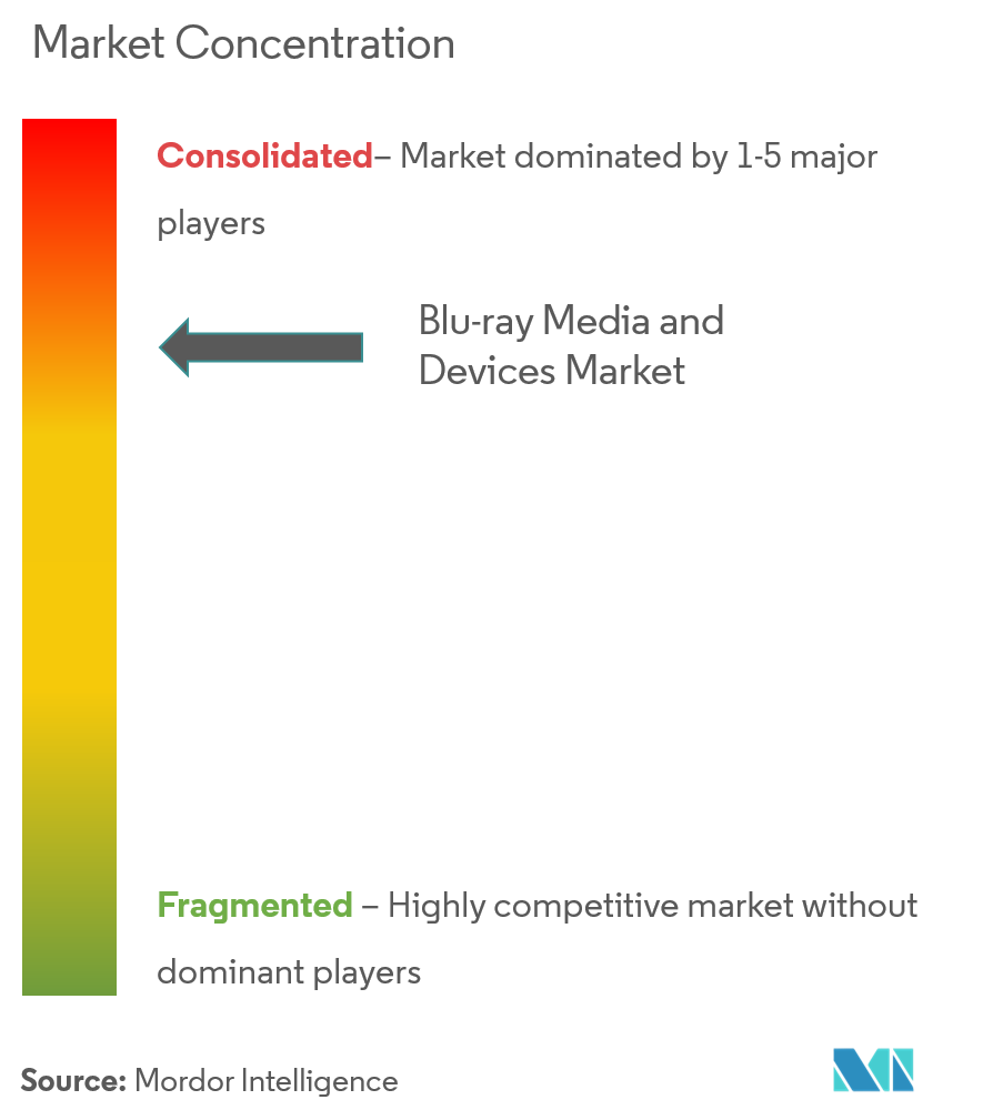 Der Markt für Blu-ray-Medien und -Geräte ist hart umkämpft, da auf dem Markt viele namhafte Akteure vertreten sind, die nationale und internationale Produkte anbieten. Der Markt scheint fragmentiert zu sein, da nur wenige Akteure einen nennenswerten Marktanteil haben. Die Strategien der großen Player sind Produktinnovationen sowie Fusionen und Übernahmen, um ihr Produktportfolio zu erweitern und der Konkurrenz einen Schritt voraus zu sein. Zu den wichtigsten Marktteilnehmern zählen unter anderem Koninklijke Philips NV, LG Electronics Inc. und Panasonic Corporation.