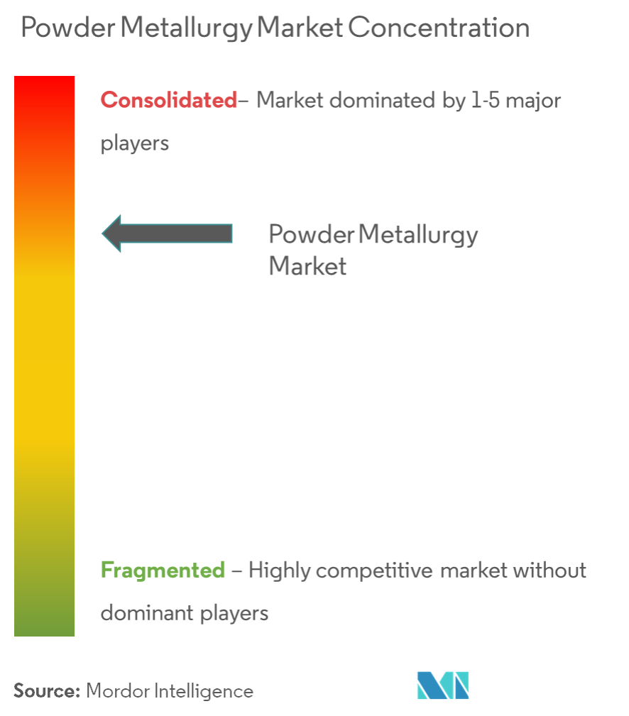 Der Pulvermetallurgie-Markt ist mäßig fragmentiert. GKN Powder Metallurgy investiert in polymerfreie Rohstoffe zur Verbesserung der Nachhaltigkeit, während Carpenter Technology pulveroptimierte Superlegierungen für Energieturbinen und medizinische Implantate betont. Nischenspieler differenzieren sich durch Design-zu-Teil-Services, schnelles Sintern und proprietäre Legierungschemien.