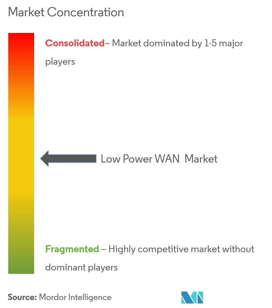 El mercado de WAN de bajo consumo está moderadamente fragmentado. Con el aumento del ecosistema de IoT, también están evolucionando diversas tecnologías, como LPWAN, lo que impulsa a los actores a invertir en el mercado. Además, los actores están ingresando al mercado gradualmente con la actualización tecnológica. Algunos actores clave incluyen Cisco Systems Inc., Sigfox SA, ATT Inc., Vodafone Group PLC, Semtech Corporation, Huawei Technologies Co. Ltd e Ingenu Inc.