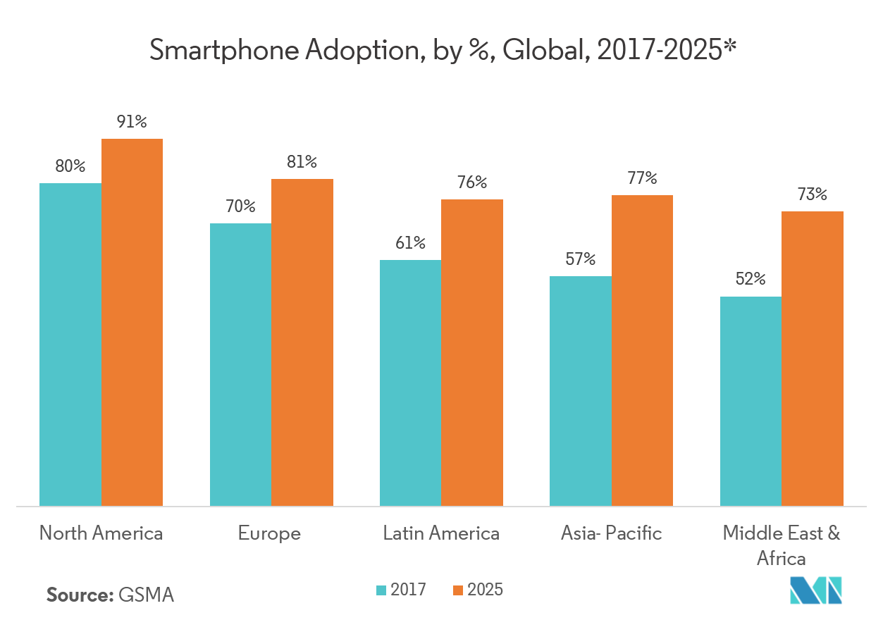 - Según GSMA, en América del Norte, se estima que el número de suscriptores de teléfonos inteligentes alcanzará los 328 millones para el año 2025. Además, para 2025, se espera que la región sea testigo de un aumento en las tasas de penetración de Internet (80%) y de suscriptores móviles (86%). %). Es probable que la creciente demanda de teléfonos móviles brinde oportunidades lucrativas para el crecimiento del mercado estudiado.