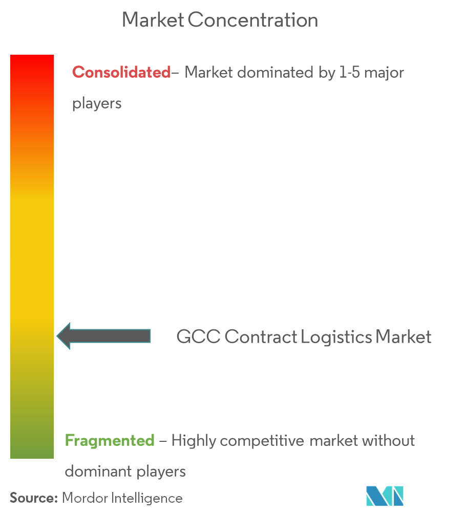 L'industrie de la logistique contractuelle du CCG est modérément concentrée. Les intégrateurs mondiaux tels que DHL Supply Chain, CEVA Logistics et Kuehne + Nagel concurrencent contre les champions régionaux Aramex, Gulf Warehousing Company et Almajdouie Logistics. Les investissements d'automatisation redéfinissent le terrain de jeu ; l'engagement de 1 milliard EUR (1,16 milliard USD) de DHL et son pacte avec Boston Dynamics pour ajouter 1 000 robots étendant la productivité et sécurité. CEVA déploie des tours de contrôle basées cloud qui alimentent les moteurs de route IA, tandis que Kuehne + Nagel fait évoluer les sites de grade pharmaceutique à Dubai South.