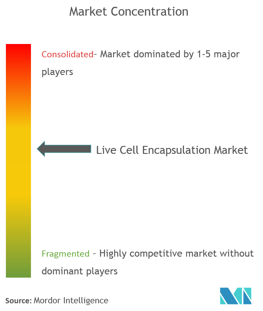 Le marché de l'encapsulation cellulaire vivante est modérément fragmenté. Aucun acteur unique ne contrôle plus de 10 % des revenus mondiaux, et les cinq premiers commandent probablement 35-40 %. La différenciation se centre sur les polymères propriétaires, les conceptions de puces microfluidiques et les suites de contrôle qualité automatisées. Les dépôts de brevets dépassent maintenant 200 annuellement, pourtant la plupart couvrent des avancées incrémentielles telles que de nouveaux réticulants ou des algorithmes de détection en ligne plutôt que des percées radicales.