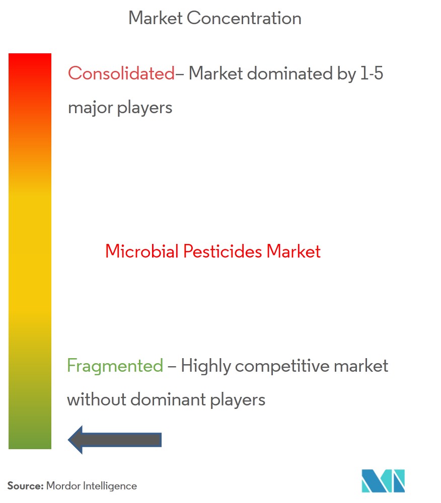 Le marché des pesticides microbiens est extrêmement fragmenté, avec un grand nombre dentreprises contrôlant la majorité des parts de marché, ainsi que plusieurs petites entreprises et marques privées. Bayer CropScience AG, FMC Corporation, Koppert Biological Systems, Valent Biosciences Corporation et Certis USA LLC sont quelques-unes des principales entreprises du marché étudié. Les lancements de nouveaux produits, les partenariats et les acquisitions sont les principales stratégies adoptées par les principales entreprises du marché du pays. Parallèlement aux innovations et aux expansions, les investissements dans la RD et le développement de nouveaux portefeuilles de produits seront probablement des stratégies cruciales dans les années à venir. Les acquisitions majeures entre entreprises pour développer des pesticides microbiens indiquent que lattention portée aux produits biosourcés augmente rapidement. Les acteurs du marché investissent massivement sur ce marché pour diversifier leurs divisions de recherche biologique sur un marché en expansion.