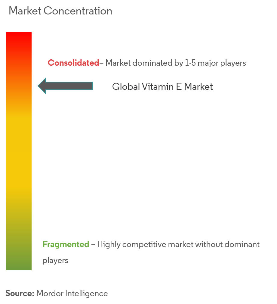 Le marché de la vitamine E démontre une fragmentation modérée. Les grandes entreprises mondiales telles que BASF SE, DSM-Firmenich NV, Archer-Daniels-Midland Company, Wilmar International Limited et Merck KGaA opèrent aux côtés d'acteurs régionaux et de fournisseurs d'ingrédients naturels. La fragmentation du marché découle des exigences d'application diverses et de la distribution géographique, avec des avantages concurrentiels variés à travers les segments.