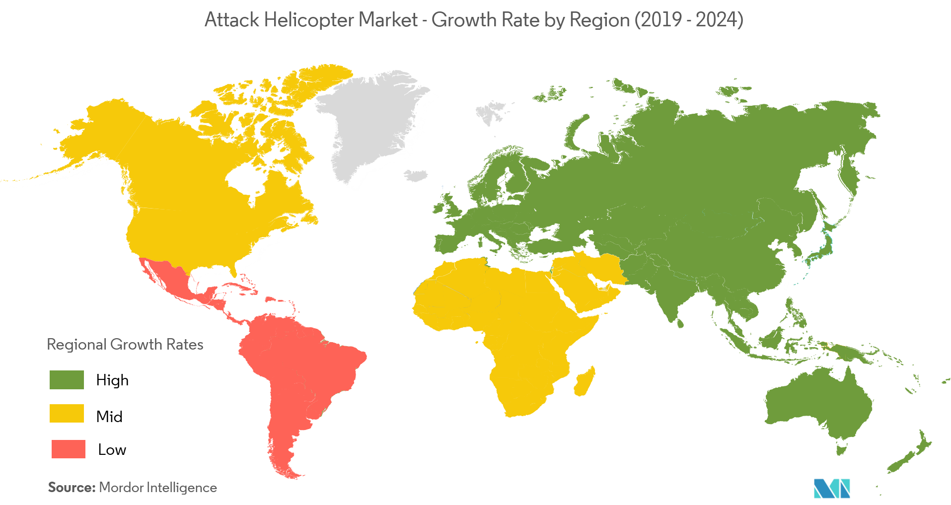 - Additionally, India has ordered 22 AH-64 Apache helicopters, and it received the first helicopter in May 2019. The order for 22 attack helicopters was placed, in September 2015. With such procurement plans underway, the growth of the market is expected to be highest during the forecast period.