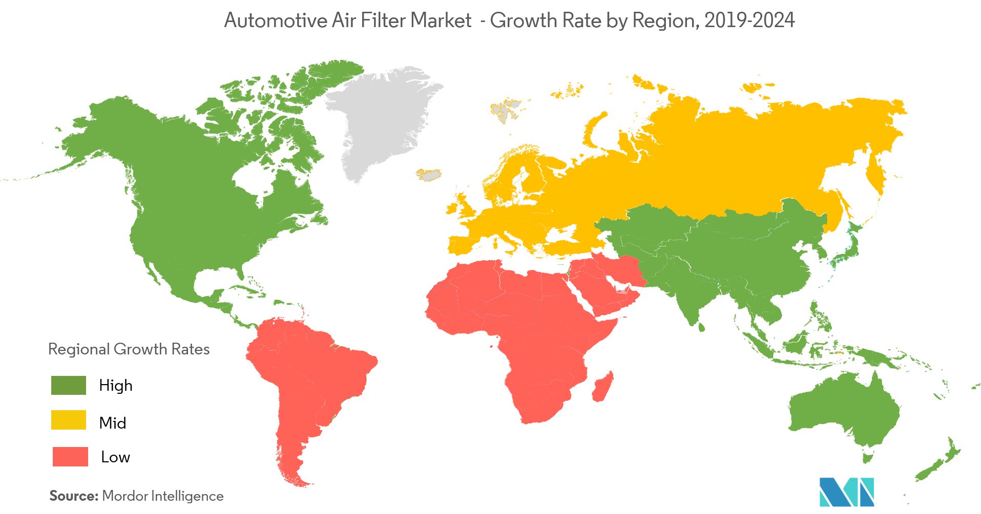 - By geography, Asia-Pacific accounted for 38.75% of the automotive air filter market share in 2024 and is expected to post the quickest 6.41% regional CAGR through 2030.