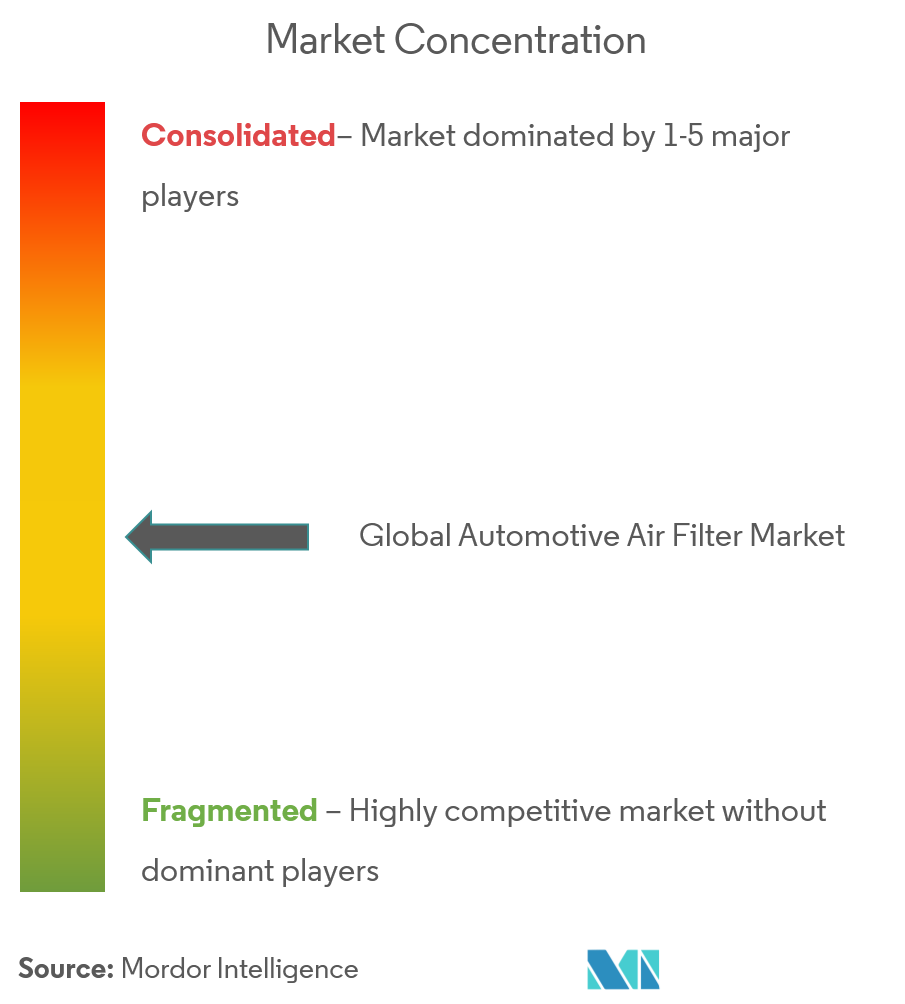 Industry concentration is low, as the market has the presence of several OEM and aftermarket companies. MANN+HUMMEL deploys predictive filter-life algorithms linked to vehicle telematics, moving toward service-as-a-software models. Bosch’s FILTER+pro, certified against viruses and allergens, positions the brand at the health-oriented end of the spectrum.