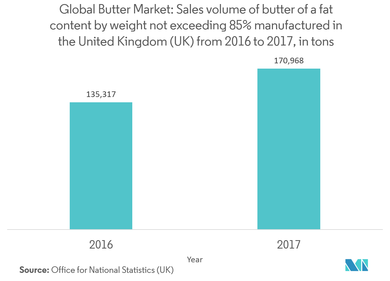 The increased adoption of home baking and cooking activities has driven global butter consumption. Consumer migration toward home-prepared meals has generated higher butter demand. This trend persists as consumers select home cooking due to health advantages and cost efficiency. According to the Agriculture and Horticulture Development Board, in 2024, 11% of survey respondents in the United Kingdom engaged in baking activities weekly, while 20% participated in baking monthly, demonstrating consistent consumer engagement in home baking [2]Agriculture and Horticulture Development Board, "Baking Trends in 2024", ahdb.org.uk. Additionally, social media platforms, specifically TikTok's "butter board" trend, have increased butter's market penetration and influenced consumer behavior toward butter-based food preparation. Manufacturers have implemented product innovations, including Land O'Lakes' butter balls, to address consumer demand for cooking efficiency. The sustained consumer engagement in home baking and cooking activities continues to drive butter market growth. This trend further strengthens the butter market.