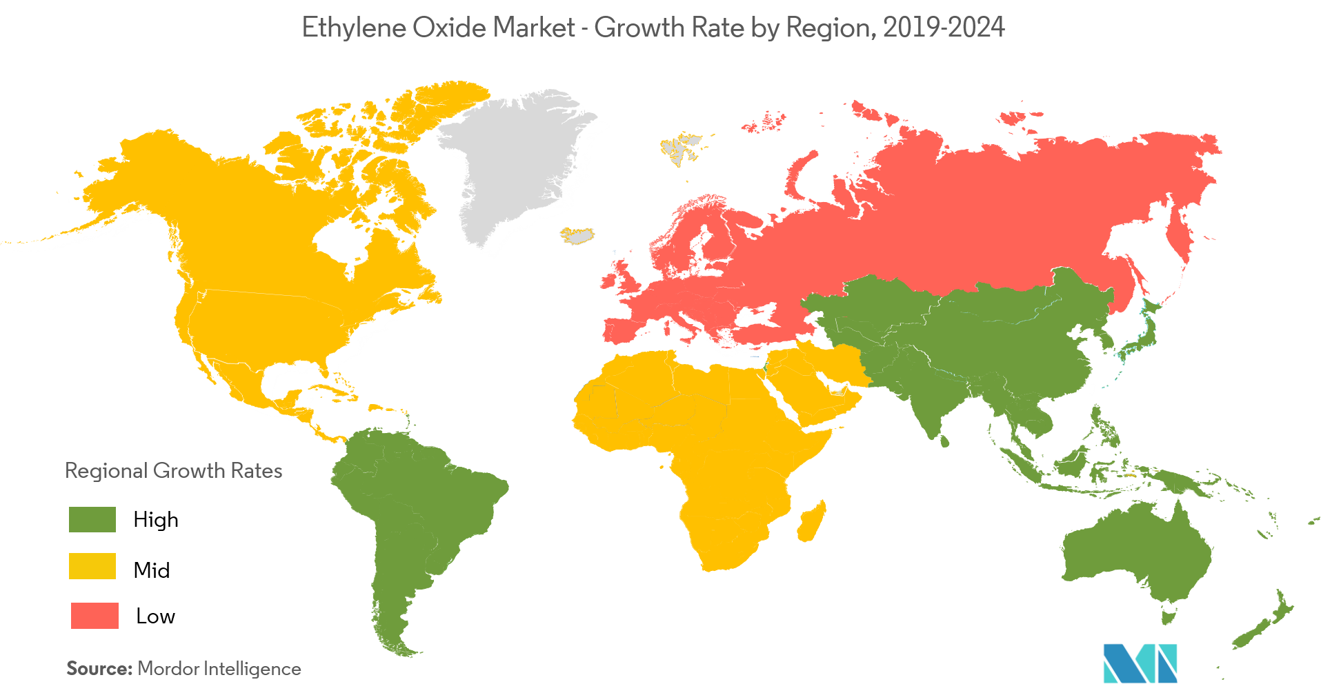 North America benefits from shale-based ethane economics that yield some of the world’s lowest ethylene cash costs. Medical device sterilization concentration elevates domestic consumption, and INEOS’s 2024 acquisition of LyondellBasell’s Bayport unit consolidates supply in the largest single market. Compliance with EPA emission rules accelerates investment in catalytic scrubbers and real-time monitoring, setting a global technology benchmark.