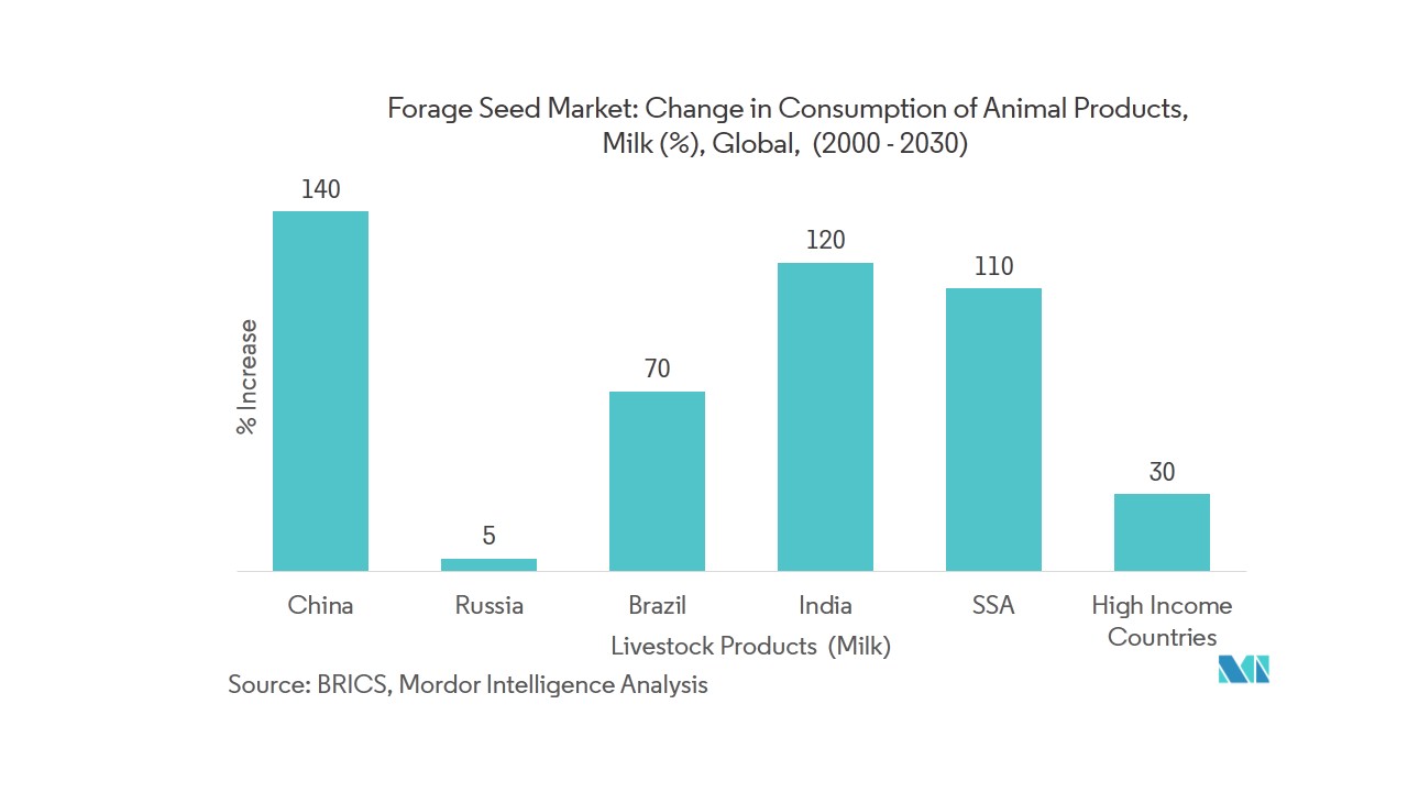 Food and Agriculture Organization (FAO) projects a 15% jump in global livestock protein demand by 2030, prompting producers to seek higher-energy forages that lift milk yields and average daily gains[1]Source: FAO, “The State of Food and Agriculture 2023,” fao.org. Dairy herds in India and Vietnam are expanding rapidly, driving premium pricing for alfalfa and other protein-rich seeds that underpin long-term feed efficiency targets. In land-constrained regions, producers maximize output per hectare using dense stands of hybrid ryegrass and clover mixes. As profitability hinges on feed conversion, demand for consistently high-quality seed forms a stable growth pillar for the forage seed market.