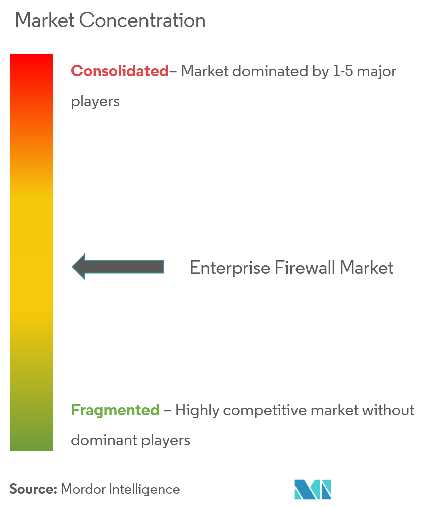 The enterprise firewall market shows moderate concentration. Fortinet, Palo Alto Networks, and Check Point anchor the field with extensive portfolios, yet the top five providers collectively control less than 70% of revenue, leaving room for innovators. Fortinet leverages over 500 AI patents to embed generative models inside its Security Fabric, while Palo Alto Networks’ Precision AI blends machine learning, deep learning, and LLMs for context-aware detection. Both firms prioritize ARR growth: Palo Alto Networks reported USD 5.1 billion in next-generation security ARR for fiscal Q1 2025, up 34% year over year.