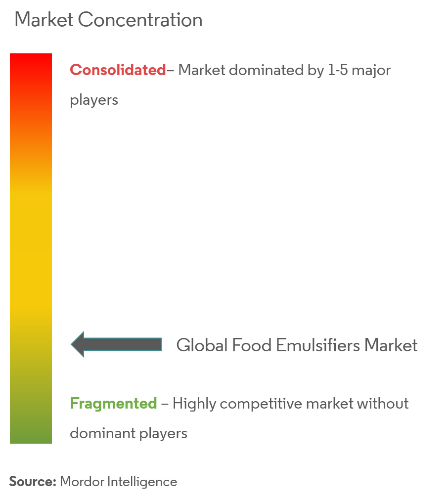 The food emulsifiers market is moderately fragmented. The key players in the market studied include Corbion NV, Cargill Incorporated, Kerry Group Plc, BASF SE, and Archer Daniels Midland Company, along with many private and domestic players operating in the regional and country-level markets. In order to increase their market shares, companies are focusing on developing new and innovative products by targeting the new formulation for food emulsifiers. Moreover, companies are focusing on increasing the production capacities of their existing plants while investing in research and development activities. Thus, the market studied is expected to witness numerous product launches during the forecast period.