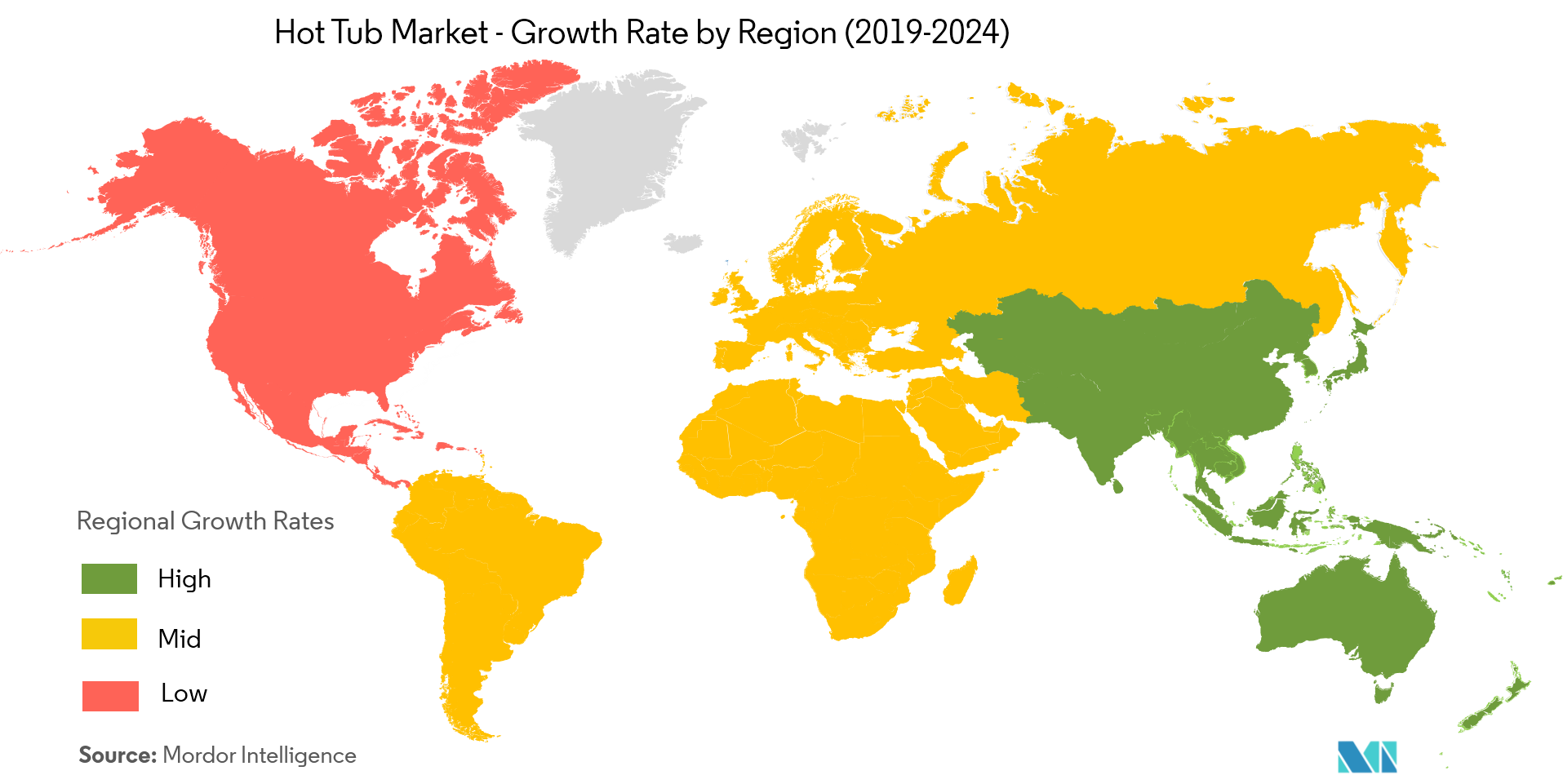 North America held 37.56% of the 2024 hot tub market share, supported by high disposable income, established service networks, and a sizable installed base needing replacement. Yet looming energy mandates shift product development toward plug-and-play heat-pump and solar-ready configurations. California’s 2026 gas-heater ban, together with variable-speed pump requirements effective September 2025, means North American manufacturers must reengineer plumbing systems for higher head pressures and integrate cloud-based remote-management dashboards as standard. Canada offers moderation, with milder regulation but similar consumer affluence, while Mexico provides cost advantages for near-shoring component supply and tapping a burgeoning middle class.