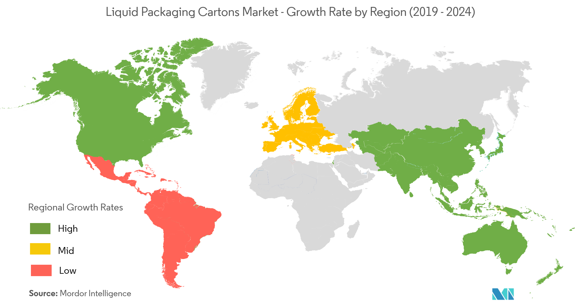 The liquid packaging cartons market is segmented by liquid type (milk, juices, energy drinks, and liquid type), geography (North America [United States and Canada], Europe [United Kingdom, Germany, France, and the Rest of Europe], Asia-Pacific [India, China, Japan, Australia & New Zealand, and the Rest of Asia-Pacific], Latin America [Brazil, Argentina, Mexico, and the Rest of Latin America], and Middle East & Africa [United Arab Emirates, Saudi Arabia, and the Rest of Middle East & Africa]). The report offers the volume in tons for the above segments.
