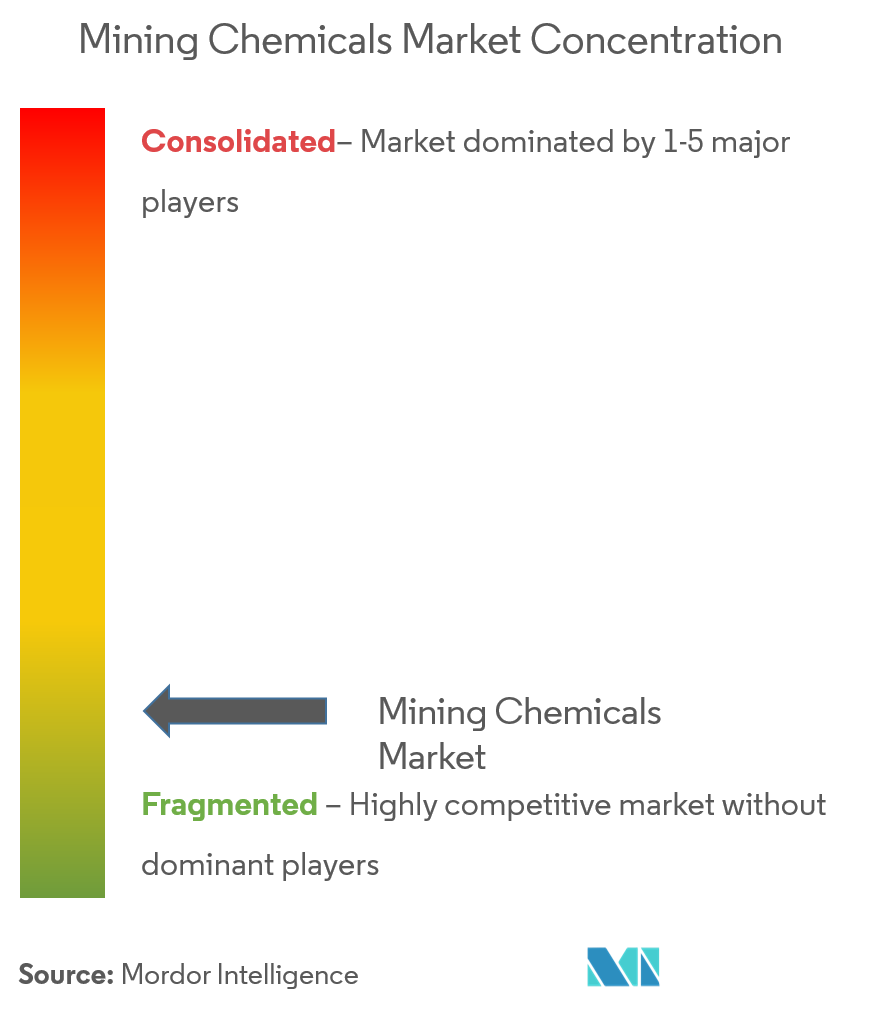 The mining chemicals market remains highly fragmented. Technology partnerships are a key strategic lever. AI platforms that integrate mill sensors with reagent dosing modules have improved recovery by up to 2 percentage points and reduced overdosing by 15%, saving operators USD 1 million per mid-size concentrator annually. Disruptive entrants such as peptide-based separation startups promise eco-friendly collectors targeting specific lattice structures. Meanwhile, equipment vendors like Metso add process chemistry to turnkey leaching packages, blurring boundaries between reagents and plant technology.
