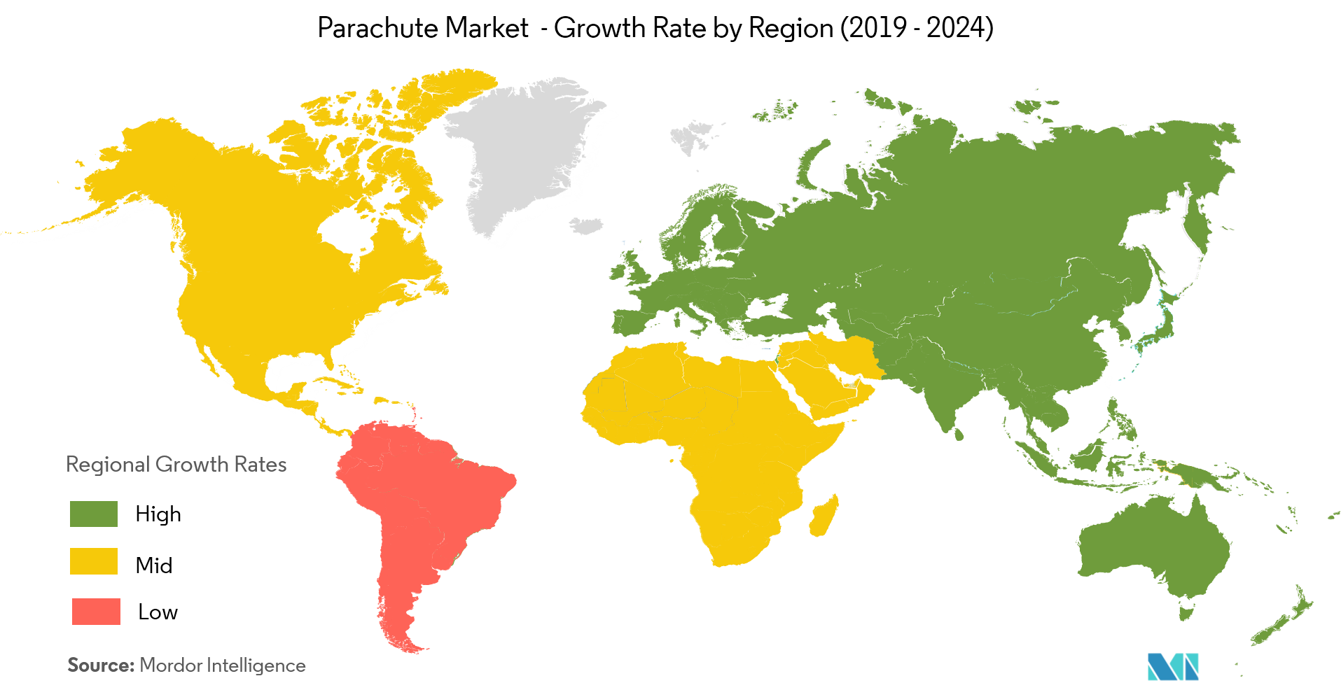 North America dominated the military parachute market with a 41.25% share in 2024, aided by the US Department of Defense’s USD 842 billion request prioritising survivability upgrades, hazard-pay increases, and next-generation aerial-delivery trials. Contractual vehicles such as multi-year Indefinite-Delivery and Indefinite-Quantity awards underpin long-run volume stability and create favourable economies of scale for incumbent US suppliers. Canada’s joint jumps with US units at Fort Liberty reinforced interoperability agendas that stimulate cross-border standardisation and pooling of reserve-parachute stocks.