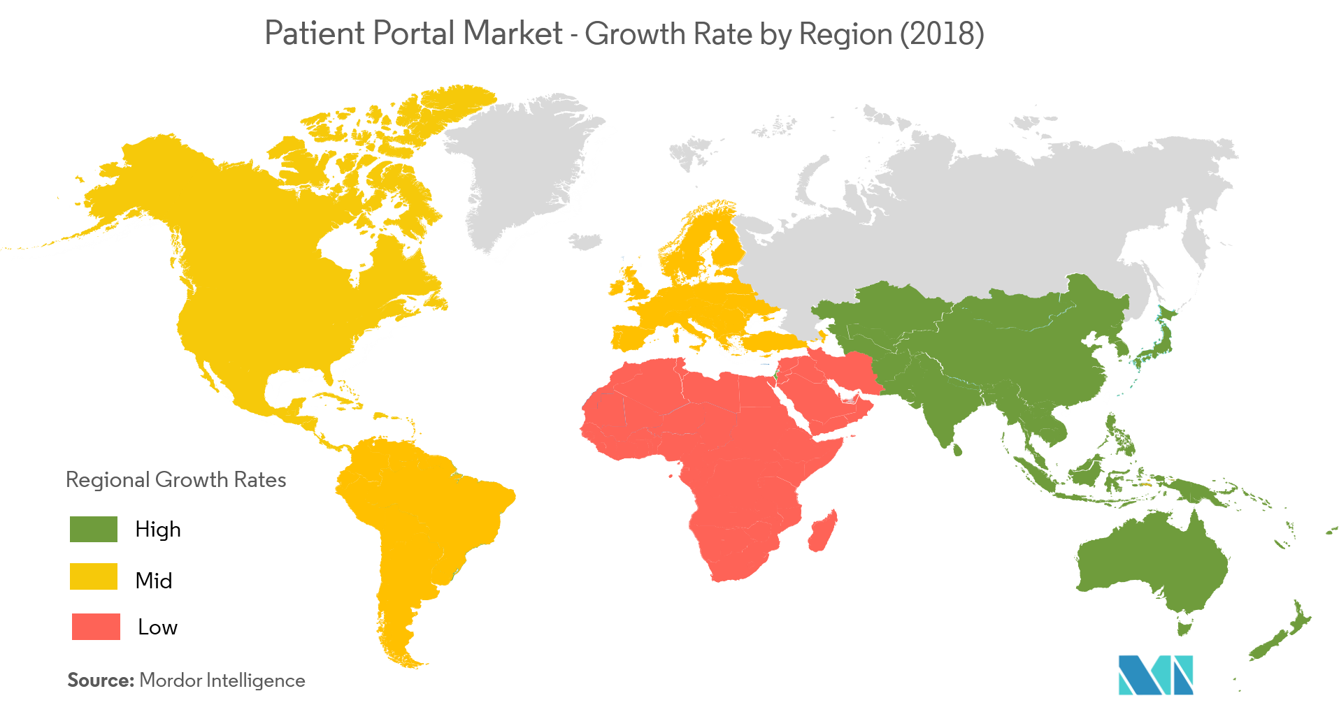 Asia-Pacific is the fastest climber with a forecast 20.29% CAGR, underpinned by government digitization grants, climbing middle-class expectations, and aggressive mobile-network expansion. Indonesia, Thailand, and Vietnam secure notable private funding—Halodoc attracted USD 100 million and Doctor Anywhere raised USD 40.8 million in 2024—to build region-specific front-door apps. China’s national health-information platform links provincial hospitals to AI chat triage, while India’s Ayushman Bharat Digital Mission issues personal health IDs that integrate seamlessly with private-sector portals. These initiatives feed a robust development funnel that elevates the patient portal market across the continent despite infrastructure gaps in rural pockets.