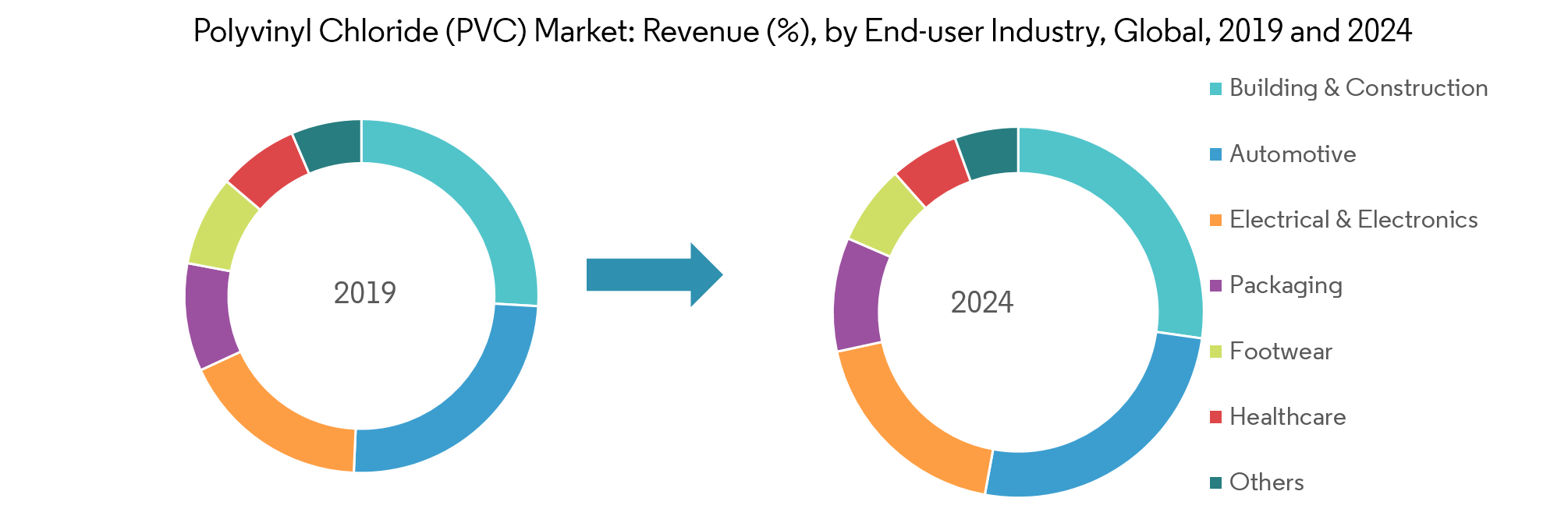 Polyvinyl chloride (PVC) is a high-strength thermoplastic material widely used in various applications, such as pipes and fittings, films and sheets, wires and cables, bottles, profiles, hoses, and tubings. The market is segmented by product type, stabilizer type, application, end-user industry, and geography. The polyvinyl chloride (PVC) market is segmented by product type into rigid PVC, flexible PVC, low-smoke PVC, and chlorinated PVC. The polyvinyl chloride (PVC) market is segmented by stabilizer type, which contains calcium-based stabilizers, lead-based stabilizers, tin- and organotin-based stabilizers, and barium-based and other stabilizers. Applications, including pipes and fittings, films and sheets, wires and cables, bottles, profiles, hoses and tubings, and other applications, further segment the market. End-user industries, like building and construction, automotive, electrical and electronics, packaging, footwear, healthcare, and other end-user industries, segment the market. The report also covers the market size and forecast for the polyvinyl chloride market in 16 countries across major regions. The market sizing and forecast for each segment are given by volume (kiloton).