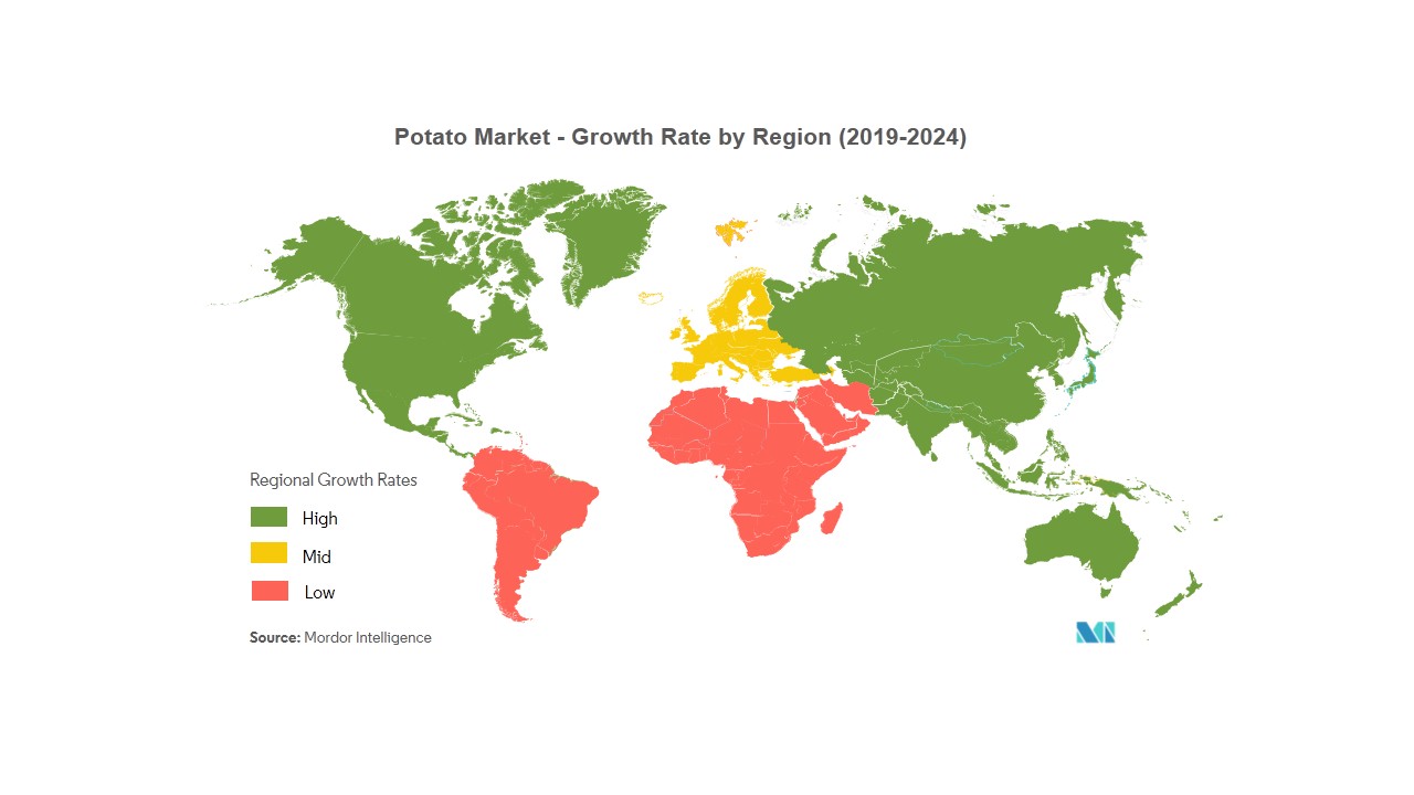 Asia-Pacific retains 50.3% of worldwide potato consumption in 2024. China’s 95.6 million-ton crop and India’s surge in new processing lines approved by the Ministry of Food Processing Industries underpin the region’s dominance and accelerate demand for on-farm cold storage and logistics upgrades[3]Source: Ministry of Food Processing Industries, “Approved Mega Food Parks and Processing Lines 2024-25,” mofpi.gov.in. The Ministry of Commerce confirmed that McDonald’s China subsidiary secured foreign-investment clearance for a network expansion to 10,000 outlets by 2028, a move anticipated to lock in long-term contracts for fries-grade potatoes[4].Source: Ministry of Commerce of the People’s Republic of China, “Foreign Investment Projects Catalogue 2025,” mofcom.gov.cn Regional growth over the next five years will rely on the rollout of aeroponic seed units and sensor platforms to smaller producers, initiatives already funded through the Asian Development Bank’s AgriTech corridor program.