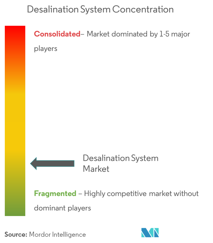 海水淡水化システム市場は断片的であり、純粋な規模よりも技術リーダーシップが優勢です。戦略提携が緊密化しています:膜メーカーはAI分析スタートアップと提携して性能保証パッケージを提供し、EPCは電力コストをヘッジするためにPV発電をバンドルしています。DuPontの海中海水淡水化コンセプトは陸上土地を90%削減し、ポンプエネルギーを40%カットし、破壊的可能性を示唆しています。グラフェン酸化物特許を持つ新興企業は、ファウリング低減を狙ってアジアの既存設備更新を開拓し、海水淡水化システム市場内での競争を激化させています。