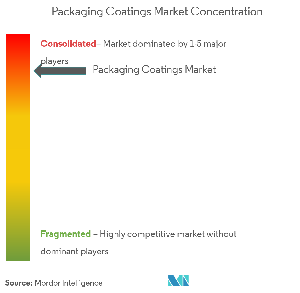 包装用コーティング市場は適度に断片化されており、上位5サプライヤー--Akzo Nobel、BASF、PPG Industries、Sherwin-Williams、Axalta--が2024年の世界シェアの約40%を占めています。これらの企業は、R&D能力、規制専門知識、原材料調達を強化するためにスケールを活用しています。大規模統合は減速しているものの、特殊UVモノマーとバイオポリマースタートアップでの標的買収は、能力ギャップに対処するための戦略的優先事項のままです。