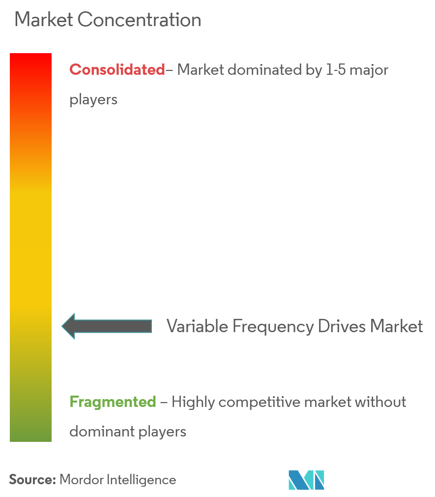 O mercado de inversores de frequência variável permaneceu moderadamente consolidado: os cinco principais fornecedores comandaram aproximadamente 45% da receita global de 2024. ABB, Siemens, Rockwell Automation, Schneider Electric e Danfoss preservaram sua participação refrescando roteiros de tecnologia de carbeto de silício e expandindo camadas de serviço digital. Entrantes chineses contestaram níveis sensíveis ao preço com micro inversores compactos de montagem PCB, pressionando incumbentes a localizar fabricação.