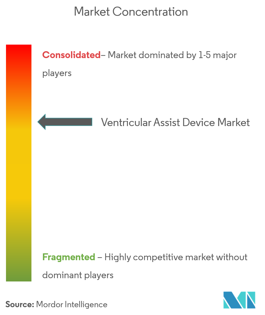 O mercado de Dispositivos de auxiliarência ventricular mostra concentração moderada: Abbott, Medtronic e Johnson & Johnson capturam aproximadamente 60% da receita global. um Abbott lidera com sua plataforma HeartMate 3 de levitação magnética, que garantiu aprovação para remover aspirina da terapia padrão, reduzindo complicações de sangramento em 40%. um Medtronic aproveita bombas Impella baseadas em cateter para dominar suporte percutâneo, enquanto um aquisição da V-aceno pela Johnson & Johnson sublinha sua estratégia de ampliar o kit de ferramentas de insuficiência cartãoíaca.