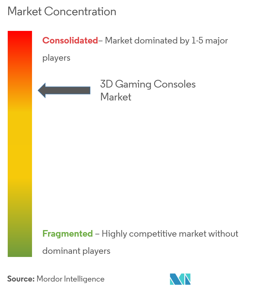 Thị trường máy chơi game 3D được hợp nhất, với những công ty lớn có thị phần tối đa. Một số công ty chủ chốt bao gồm Electronic Art Inc., Microsoft Corporation, Nintendo Co. Ltd, Sony Computer Entertainment, Guillemot Corporation SA (Thrustmaster), A4Tech Co. Ltd, Activision Publishing Inc., Logitech Inc., và Oculus VR, cùng những công ty khác.