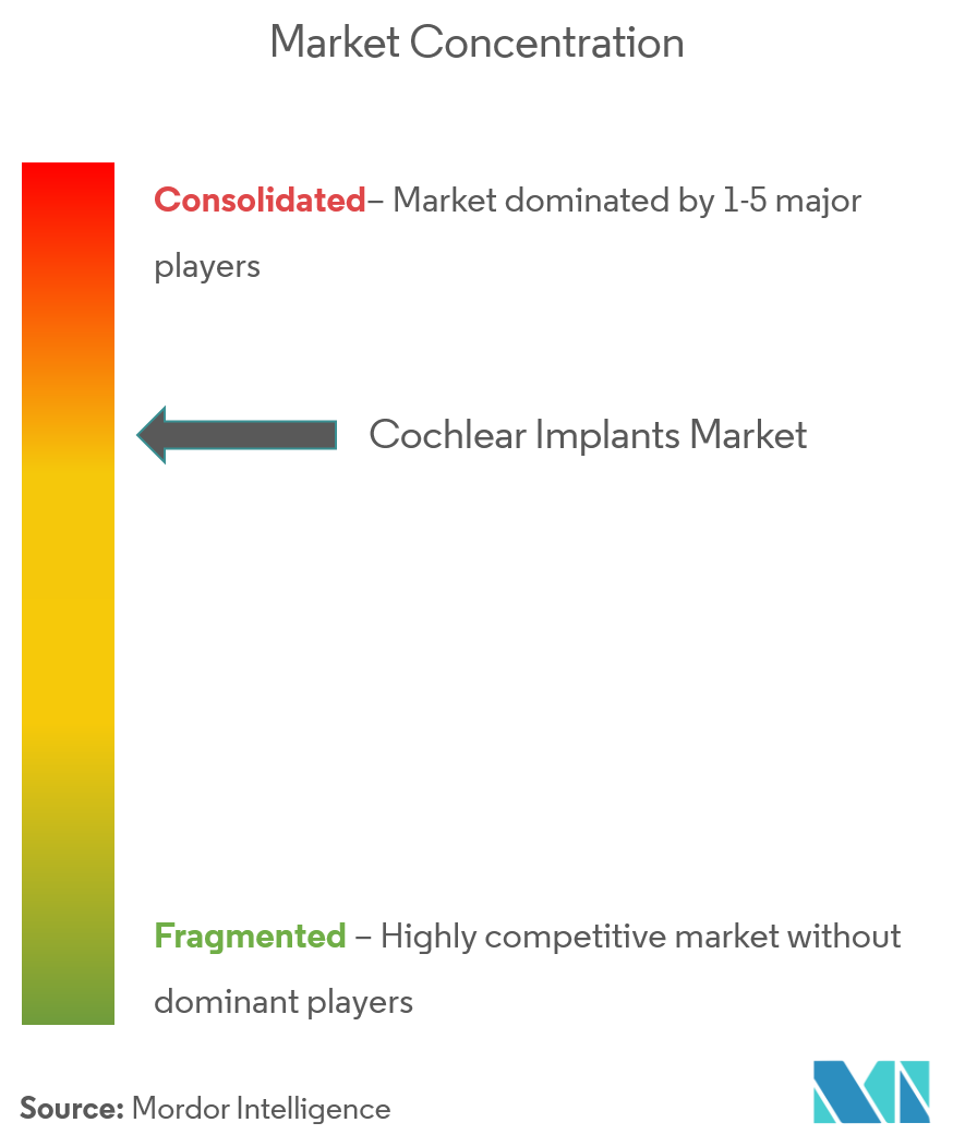 Thị trường cấy ghép ốc tai điện tử được củng cố và bao gồm một số công ty chiếm ưu thế trên thị trường. Một số công ty chủ chốt trên thị trường được nghiên cứu là MED-EL Medical Electronics, Demant A/S, Nurotron Biotechnology Co Ltd và Sonova (Advanced Bionics Corp), trong số những công ty khác. Hầu hết các công ty này đều có trụ sở tại Hoa Kỳ và Châu Âu vì những khu vực này phát triển hơn và được tài trợ tốt hơn cho hoạt động chăm sóc sức khỏe.