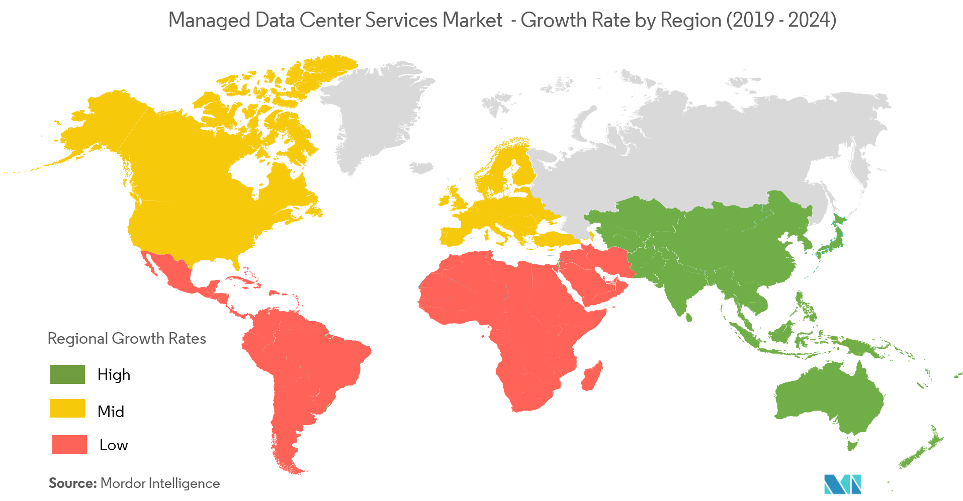 - Việc mở rộng các trung tâm dữ liệu để xử lý khối lượng dữ liệu khổng lồ có thể là do nó. Ngoài ra, việc sử dụng ngày càng tăng các dịch vụ kỹ thuật số và mạng lưới viễn thông rộng khắp trong khu vực được dự đoán sẽ hỗ trợ việc mở rộng thị trường. Ngoài ra, số lượng doanh nghiệp khởi nghiệp và doanh nghiệp vừa và nhỏ đang mở rộng trong khu vực dự kiến sẽ đẩy nhanh việc sử dụng các dịch vụ trung tâm dữ liệu. Châu Á-Thái Bình Dương đang chứng kiến sự gia tăng lượng dữ liệu được tạo ra bởi các sản phẩm và dịch vụ kỹ thuật số. Điều này là do dân số trong khu vực đang tăng lên và thương mại điện tử đang gia tăng.