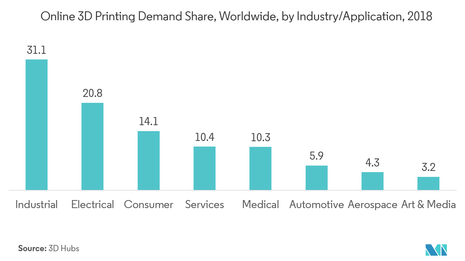 - Ngoài ra, với sự bùng nổ trong số hóa, mọi thứ, bao gồm cả in 3D, đều diễn ra trực tuyến. Các tệp 3D có thể được lưu giữ trên nền tảng trực tuyến mà khách hàng hoặc nhà phân phối có thể dễ dàng truy cập ở mọi nơi vào bất kỳ lúc nào để đặt hàng theo yêu cầu. Theo xu hướng, in 3D cho các thiết bị y tế có vẻ lạc quan. Những thực hành như vậy được kỳ vọng sẽ làm tăng thêm nhu cầu thị trường trong ngành vì chúng giúp các bác sĩ lặp lại ca phẫu thuật, giảm thời gian phẫu thuật và hạn chế thời gian đưa ra quyết định. Tuy nhiên, chi phí cao của máy sản xuất bồi đắp lai dự kiến sẽ cản trở thị trường.
