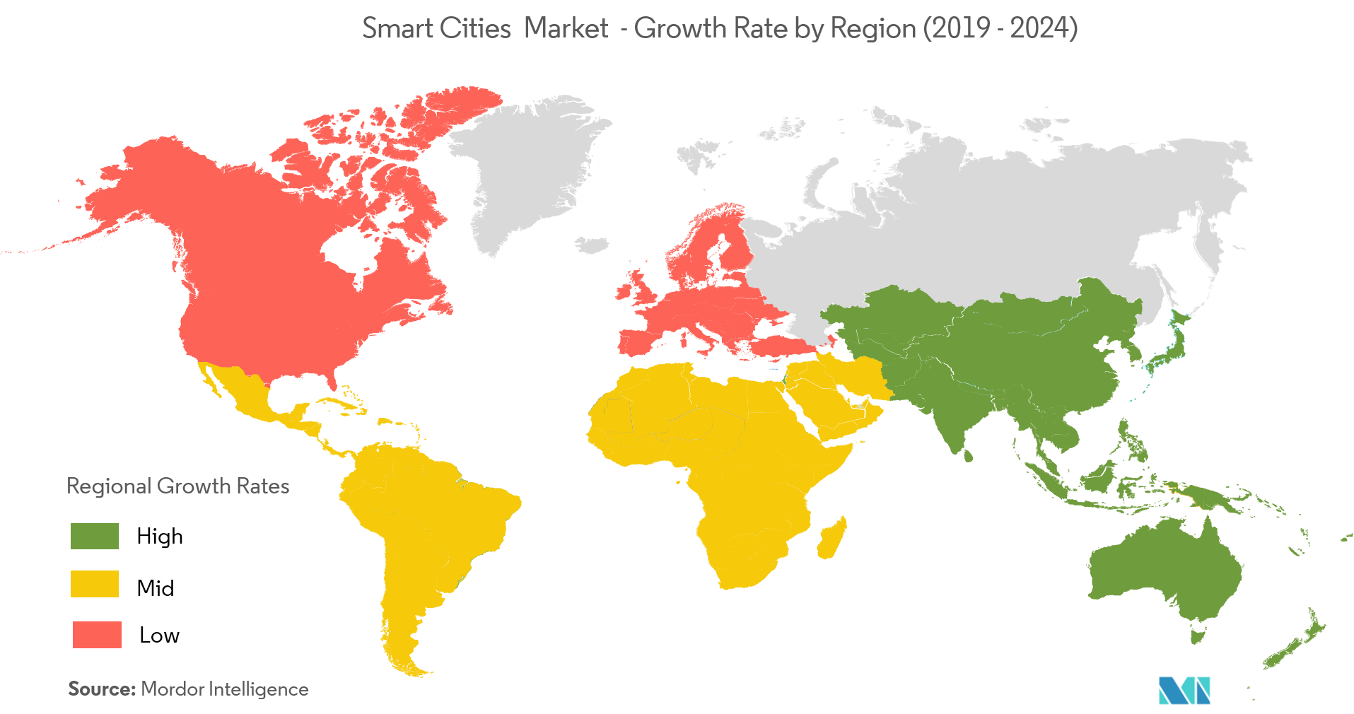 - Châu Á-Thái Bình Dương là một trong những khu vực phát triển nhanh nhất về công nghệ thành phố đổi mới, trong đó Trung Quốc đóng một vai trò quan trọng trong tăng trưởng thị trường. Trung Quốc đã đầu tư đáng kể vào việc chuyển đổi kỹ thuật số của các thành phố của mình. Với cách tiếp cận từ trên xuống trong phát triển đô thị, quốc gia này đã huy động hiệu quả các ngành công nghiệp và nguồn lực để hỗ trợ mục tiêu quốc gia là xây dựng thành phố thông minh. Trung Quốc đã xây dựng cơ sở hạ tầng thành phố thông minh và đã được áp dụng cho nhiều đô thị và khu vực chính thông qua quan hệ đối tác công tư và thúc đẩy đổi mới kỹ thuật tập trung.