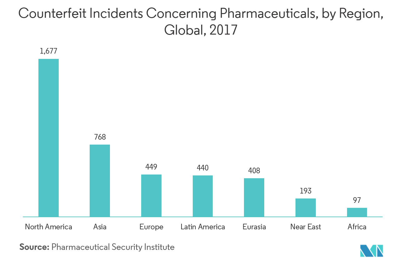 北美在2024年保持39.01%的收入,受全面DSCSA执行和需要交钥匙编码、检测和数据交换堆栈的密集CMO网络支撑。加拿大的塑料协议也推动转换商融合安全与可回收性,有利于携带隐形水印示踪剂的纤维基包装,实现自动分拣。墨西哥与美国供应链交织,在医疗器械和出口到美国的龙舌兰酒中提升防伪采用,以保障市场准入。